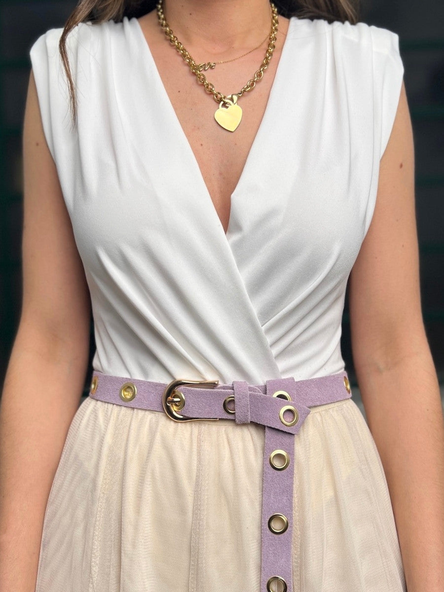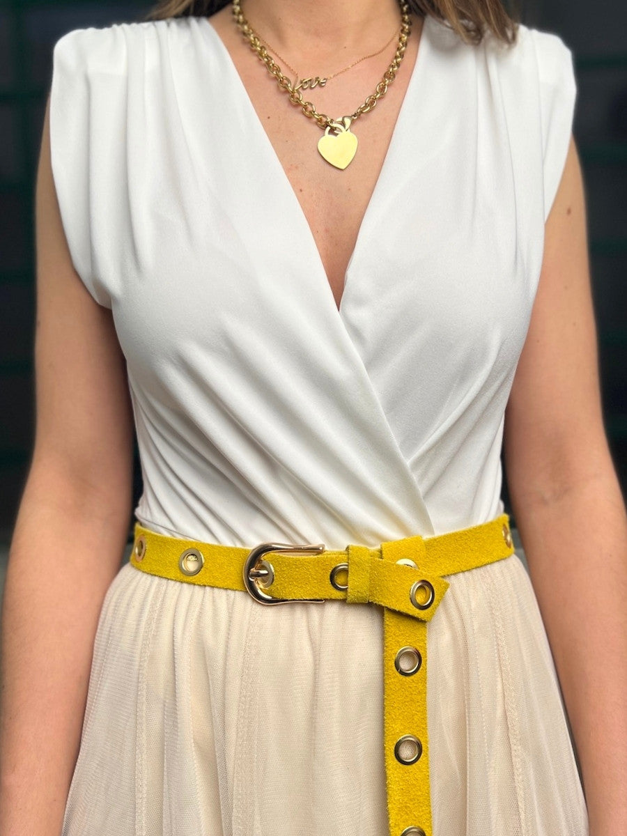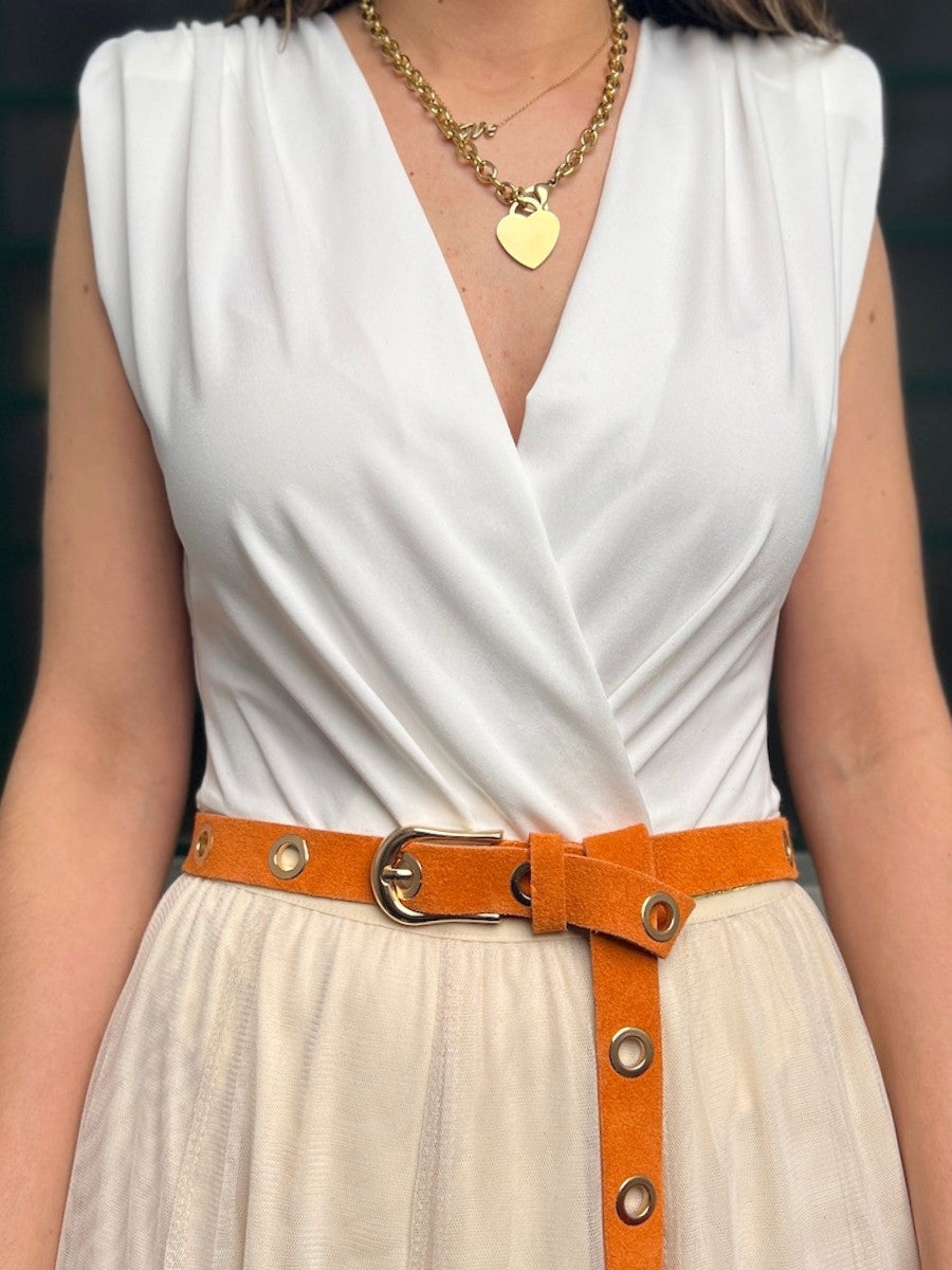 Maxi ceinture avec œillets dorés. Partenaire de style idéal pour les robes et les jupes. Peut également être porté comme ceinture.