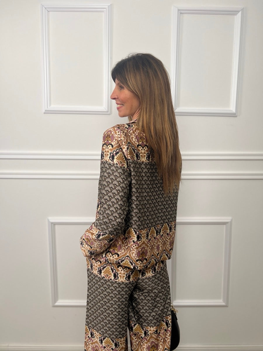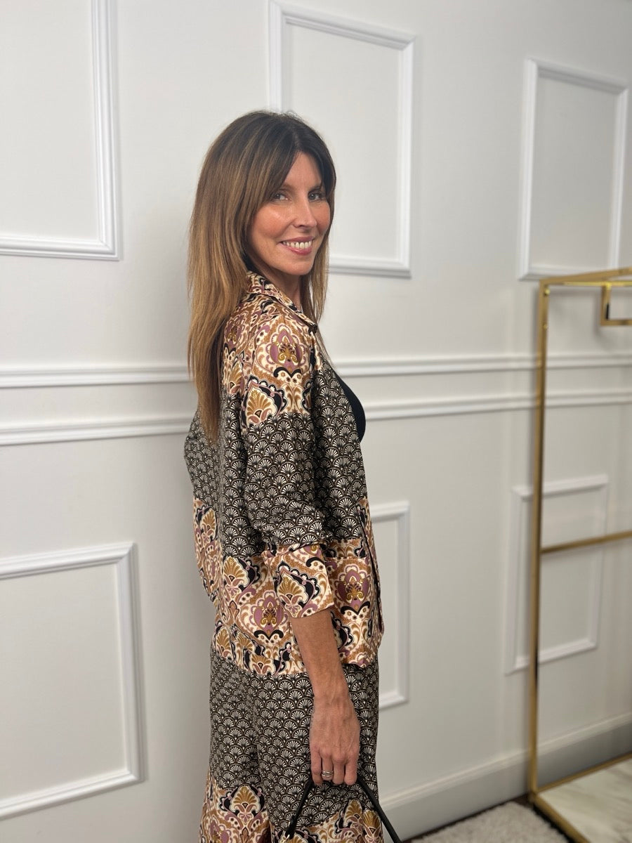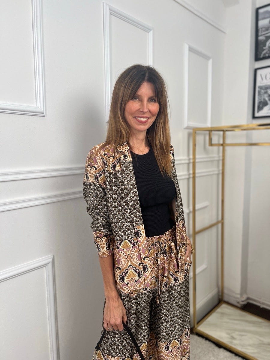 Kimono bohème long et large à manches longues et larges. L’imprimé artistique se compose d’ornements floraux rehaussés d’or. Le kimono a une longue ceinture à nouer du même imprimé.