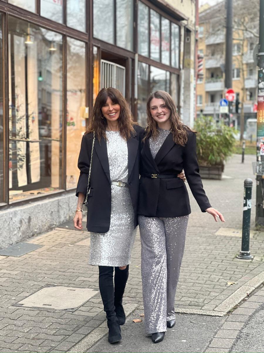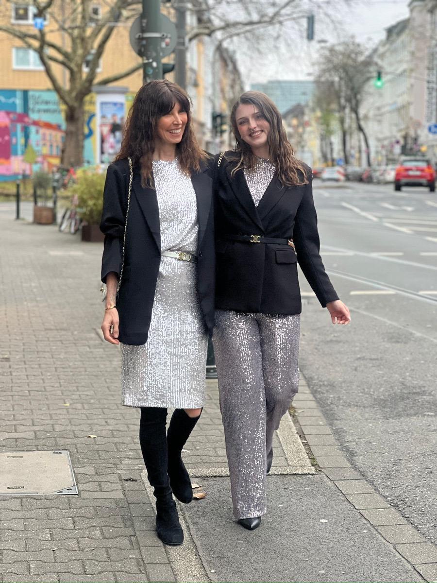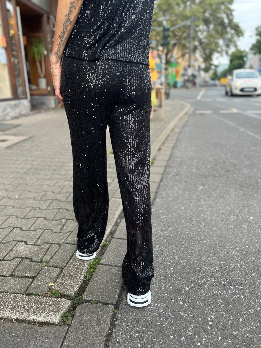 Hose mit Pailletten, elastischem Bund und leicht ausgestellt. Durch das dehnbare Material sitzt der Hose angenehm. Bitte beachtet, dass Pailletten krümeln können und nicht für langes Sitzen geeignet sind.