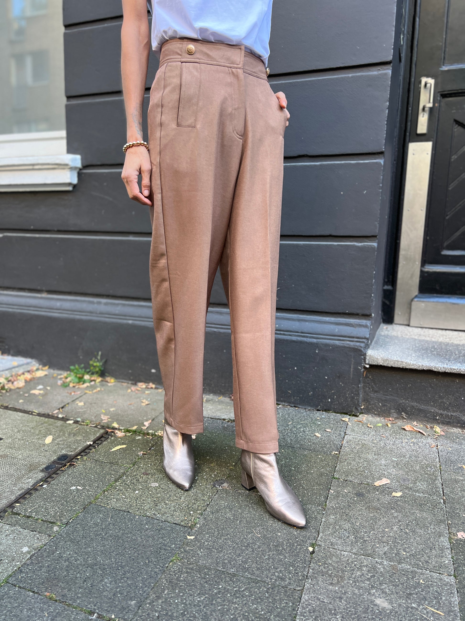 Doppelreihiger Blazer mit Klappentaschen und goldenen Knöpfen. Die Jacke hat Schulterpolster.