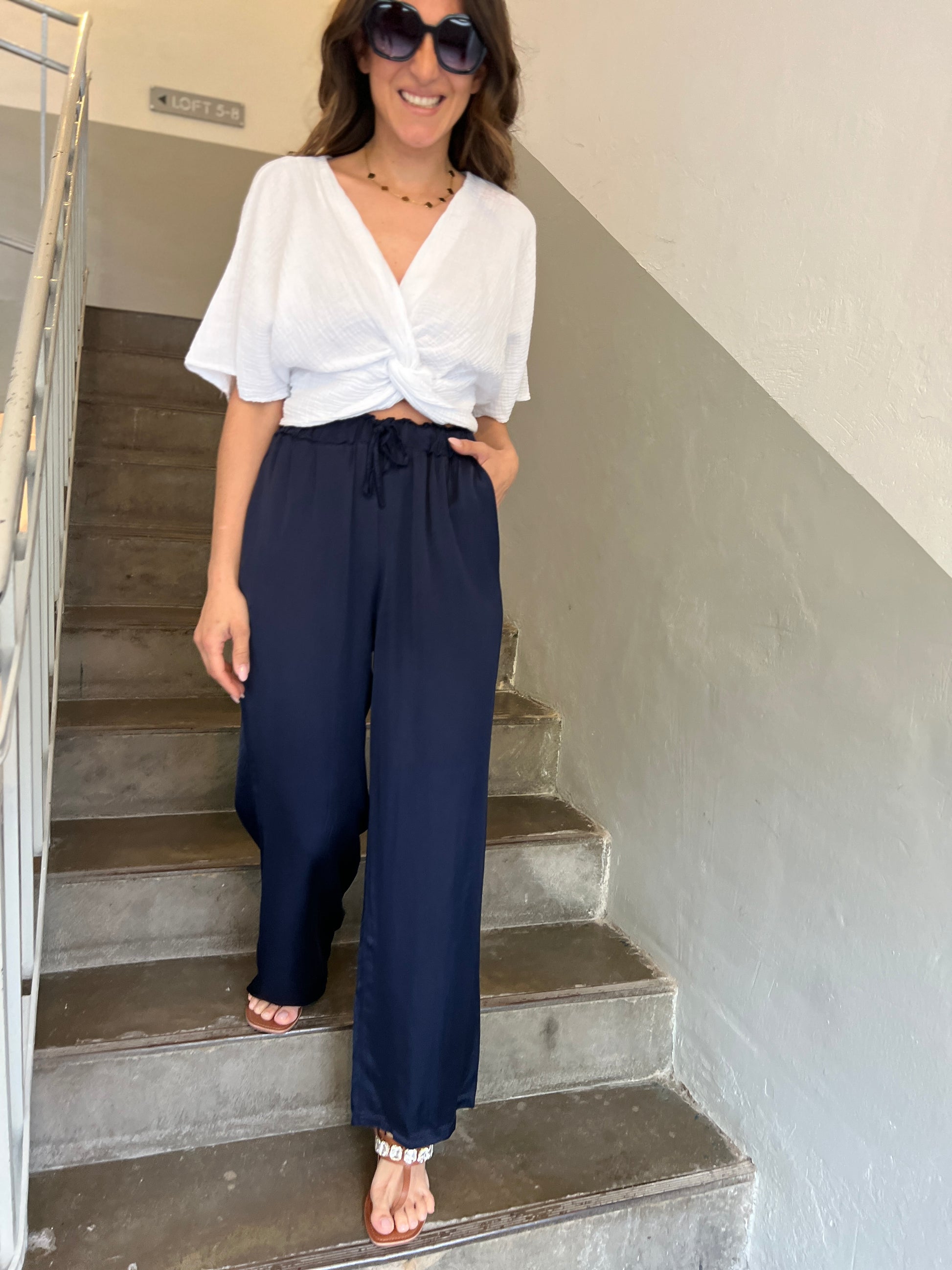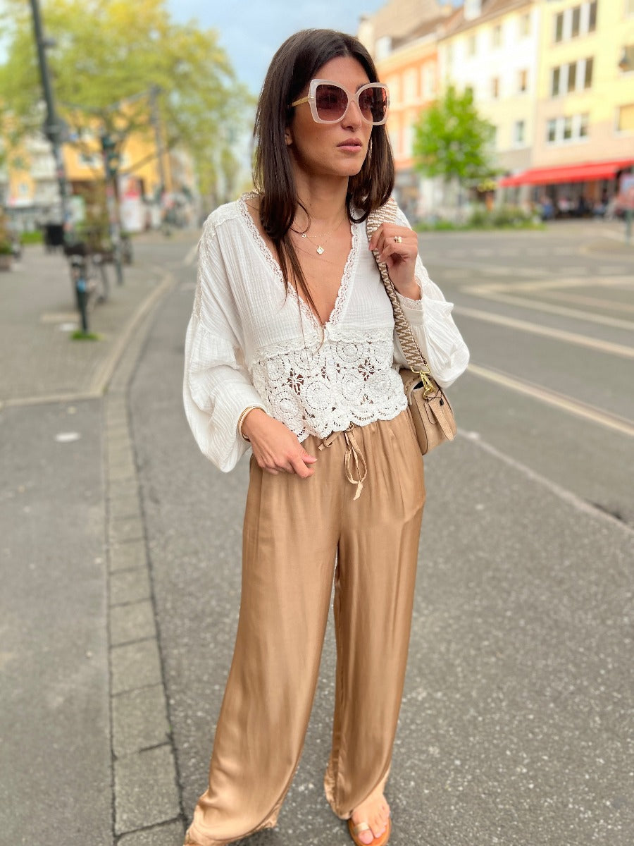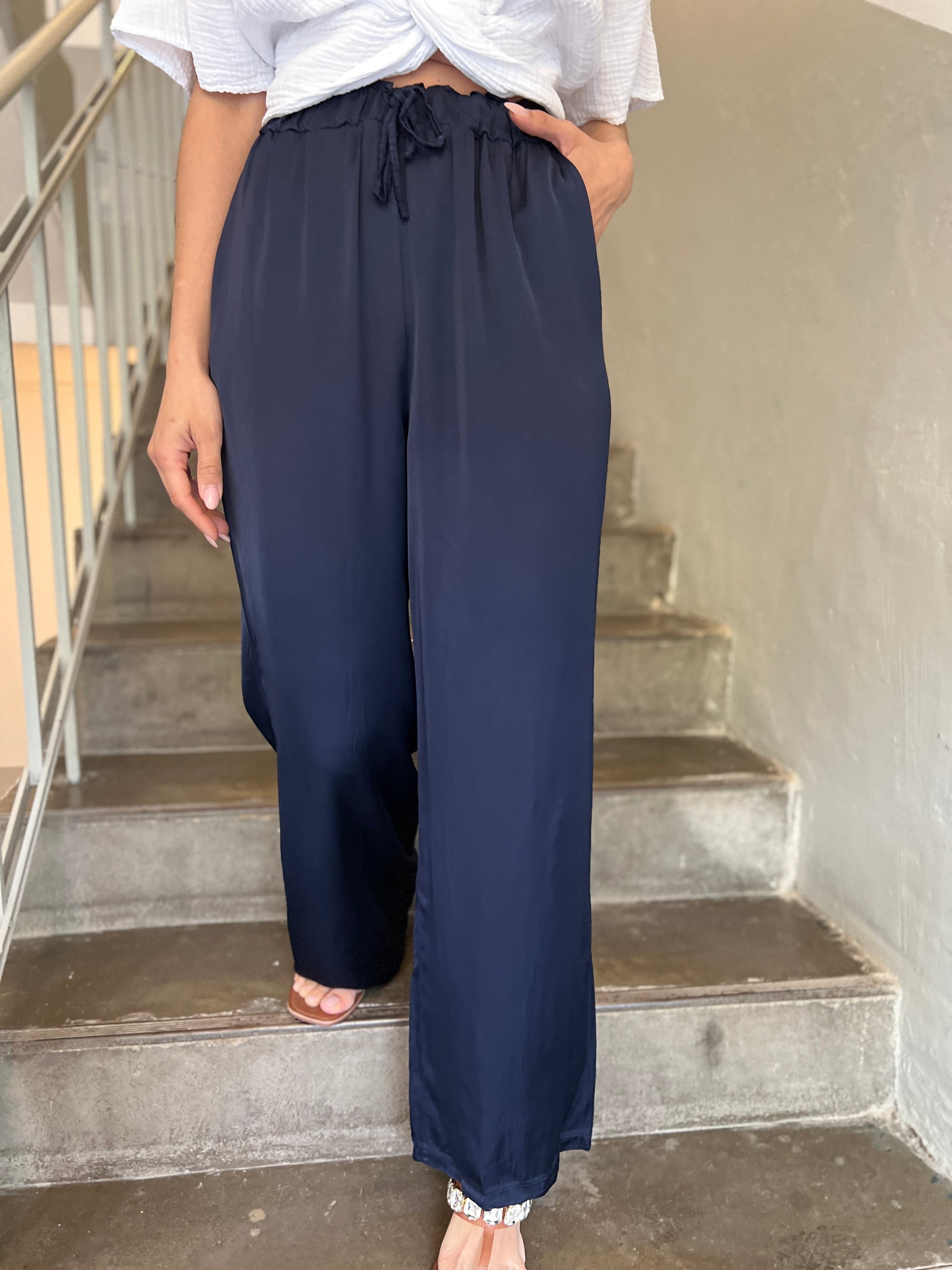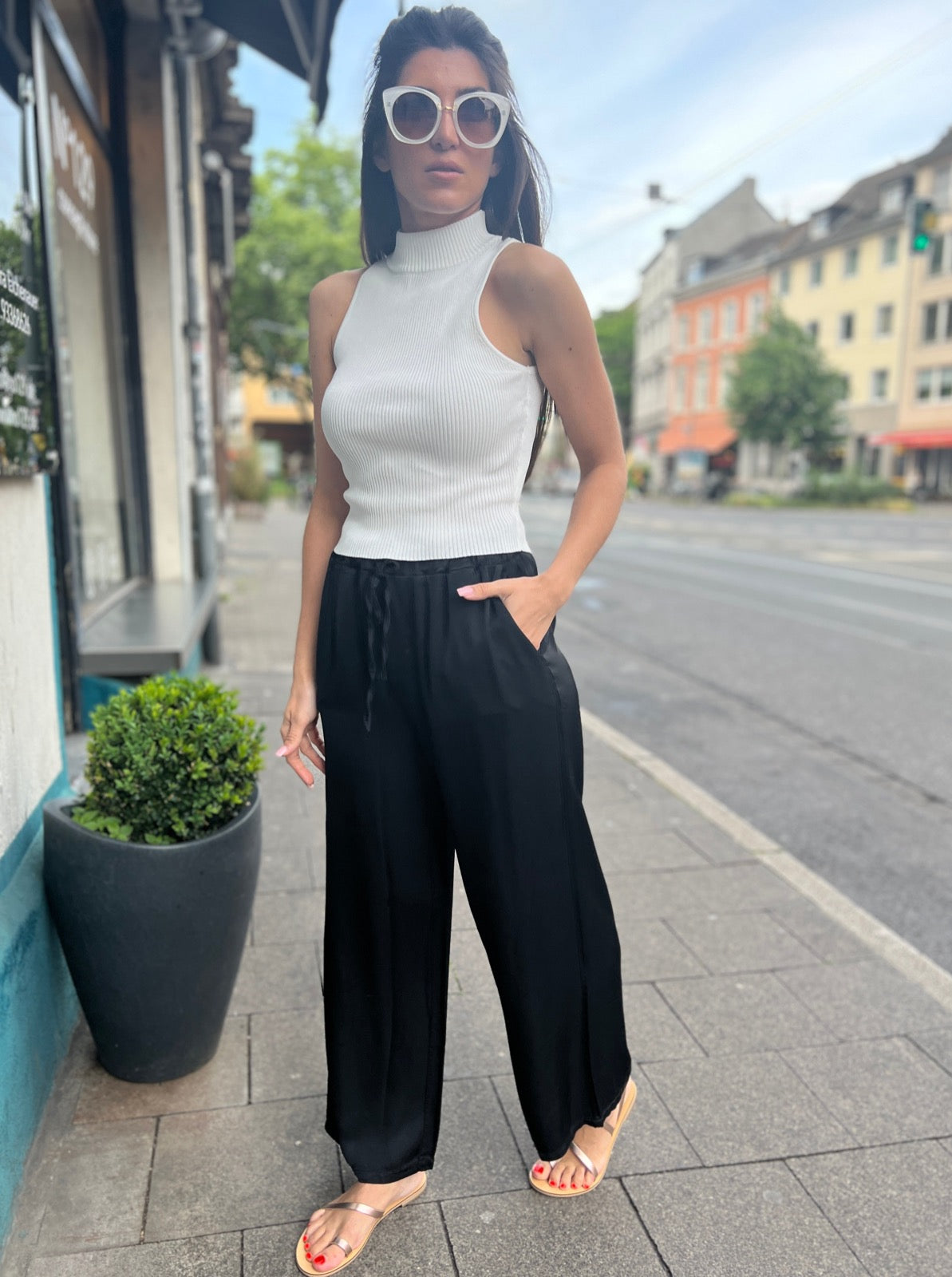 Hose in Satin-Optik mit geradem Beim und mit elastischem Bund und Kordel.
