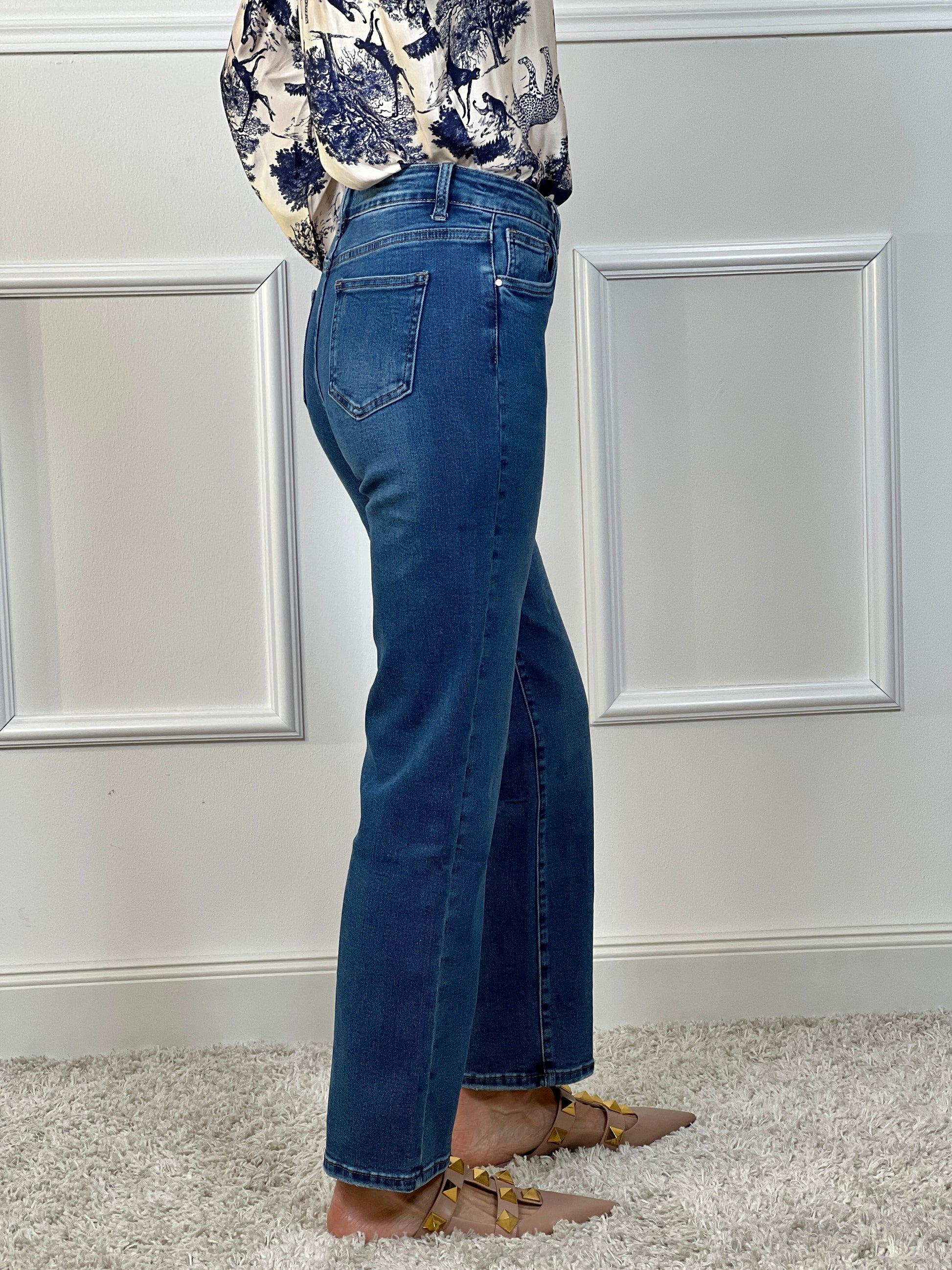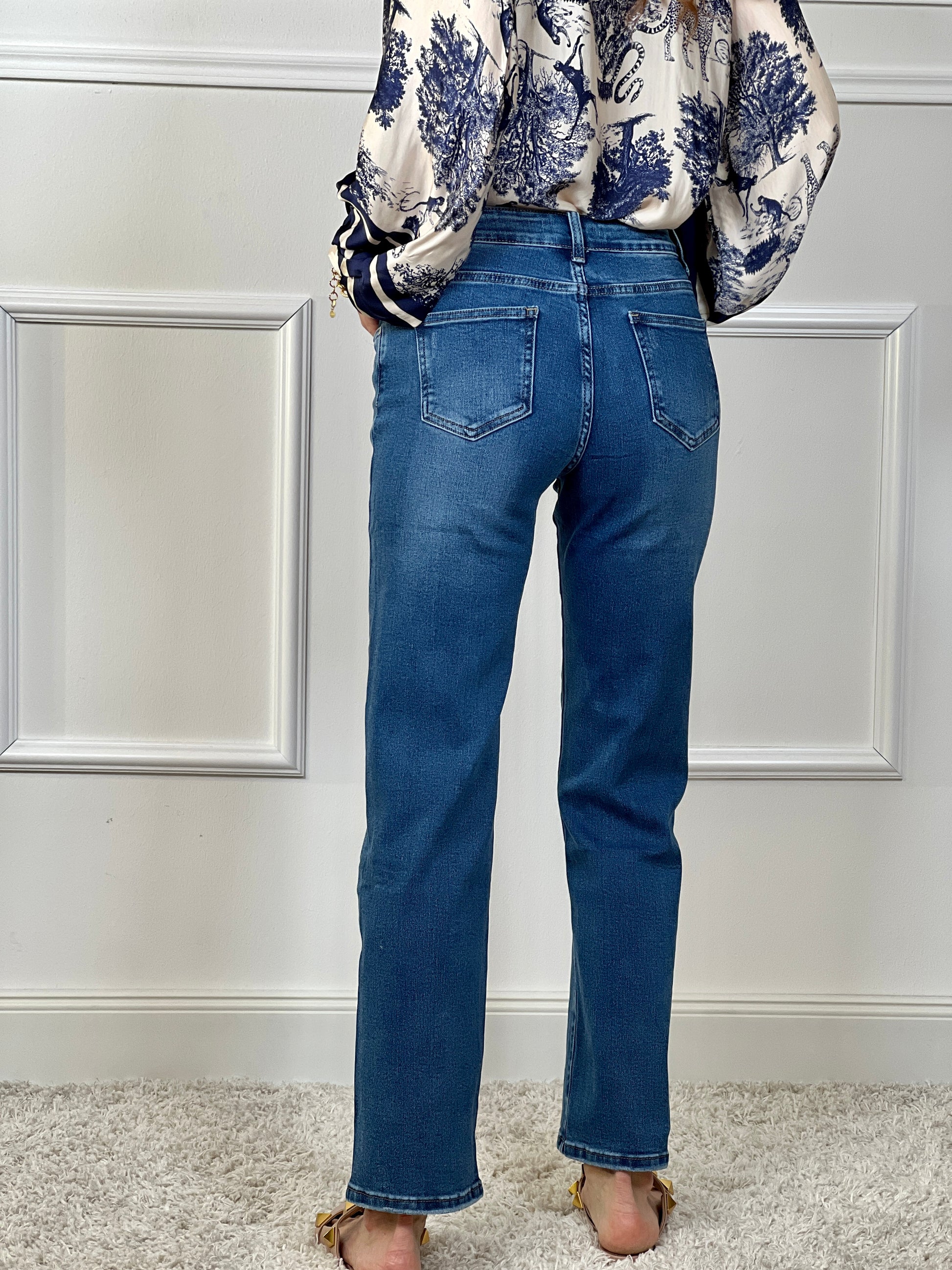 Das Material der Jeans setzt sich aus 75% Baumwolle, 23% Polyester und 2% Elasthan zusammen.