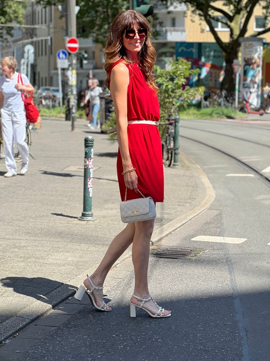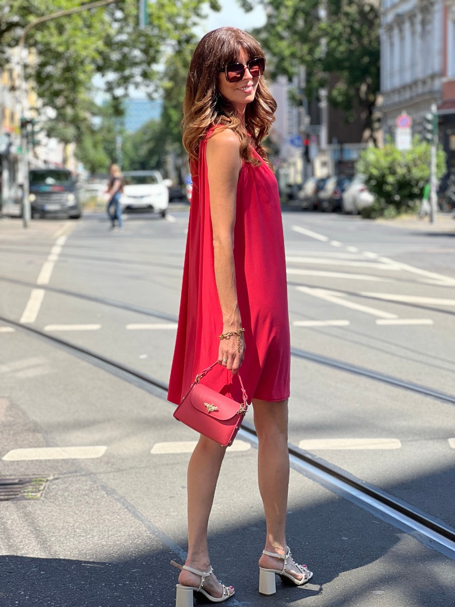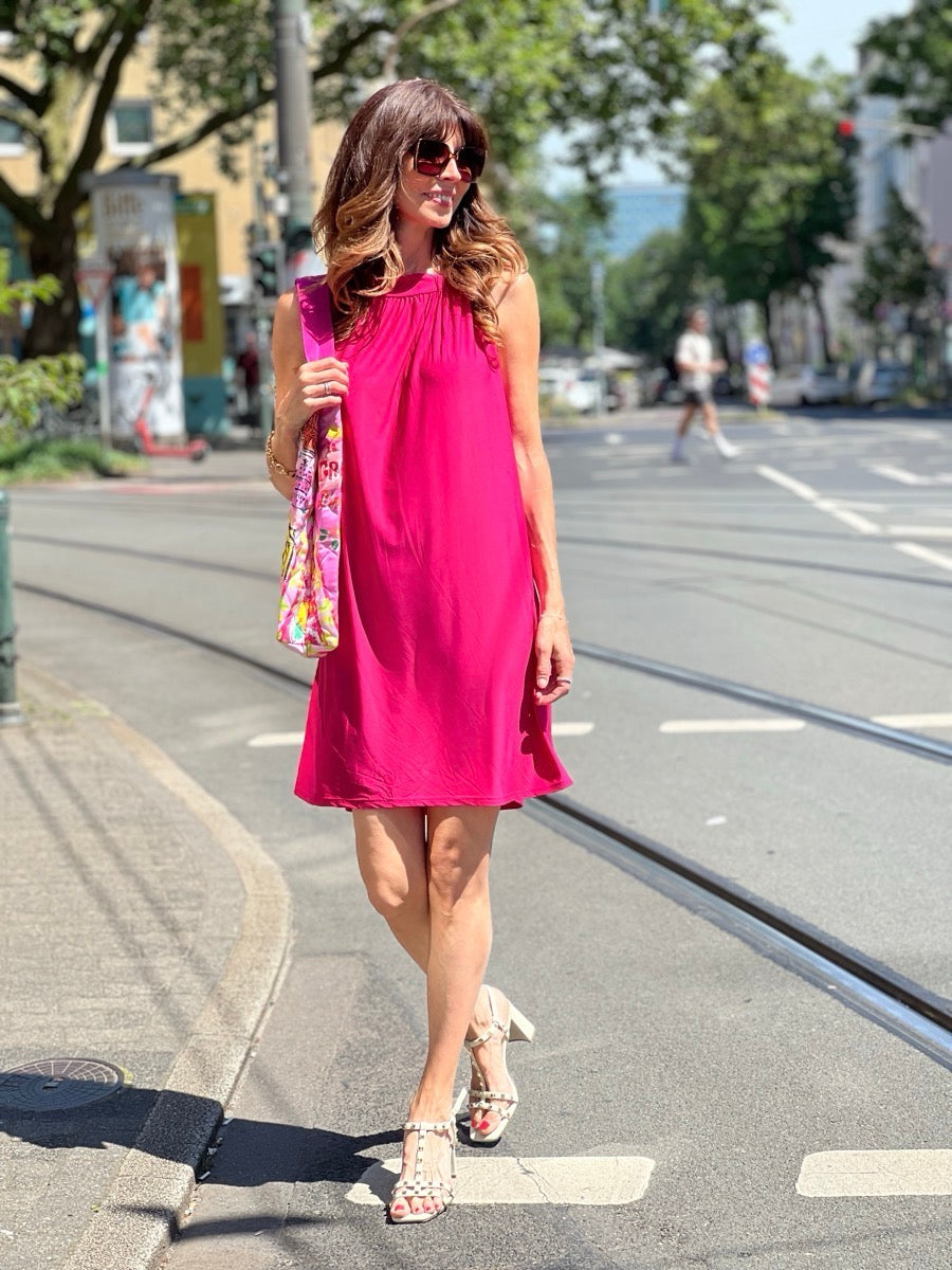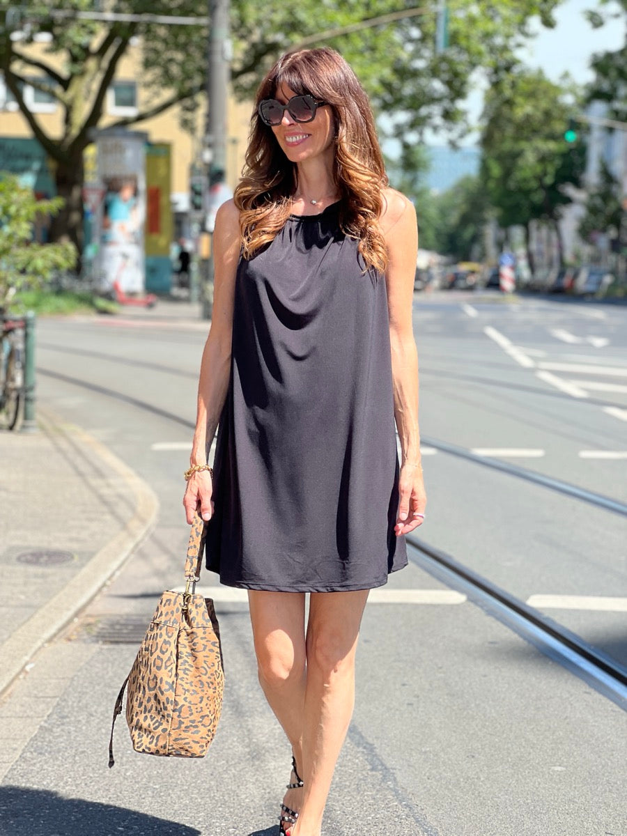 Das fließende Jersey Kleid kann im Sommer pur getragen werden und im Herbst mit coolen Bikerjacken und flauschigem Strick.