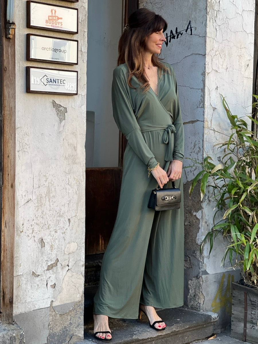 Jumpsuit mit V-Ausschnitt, Fledermaus Arm und weitem Bein. An der Taille hat der Jumpsuit einen Bindegürtel.
