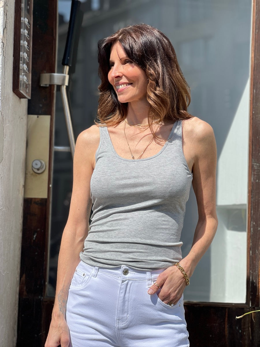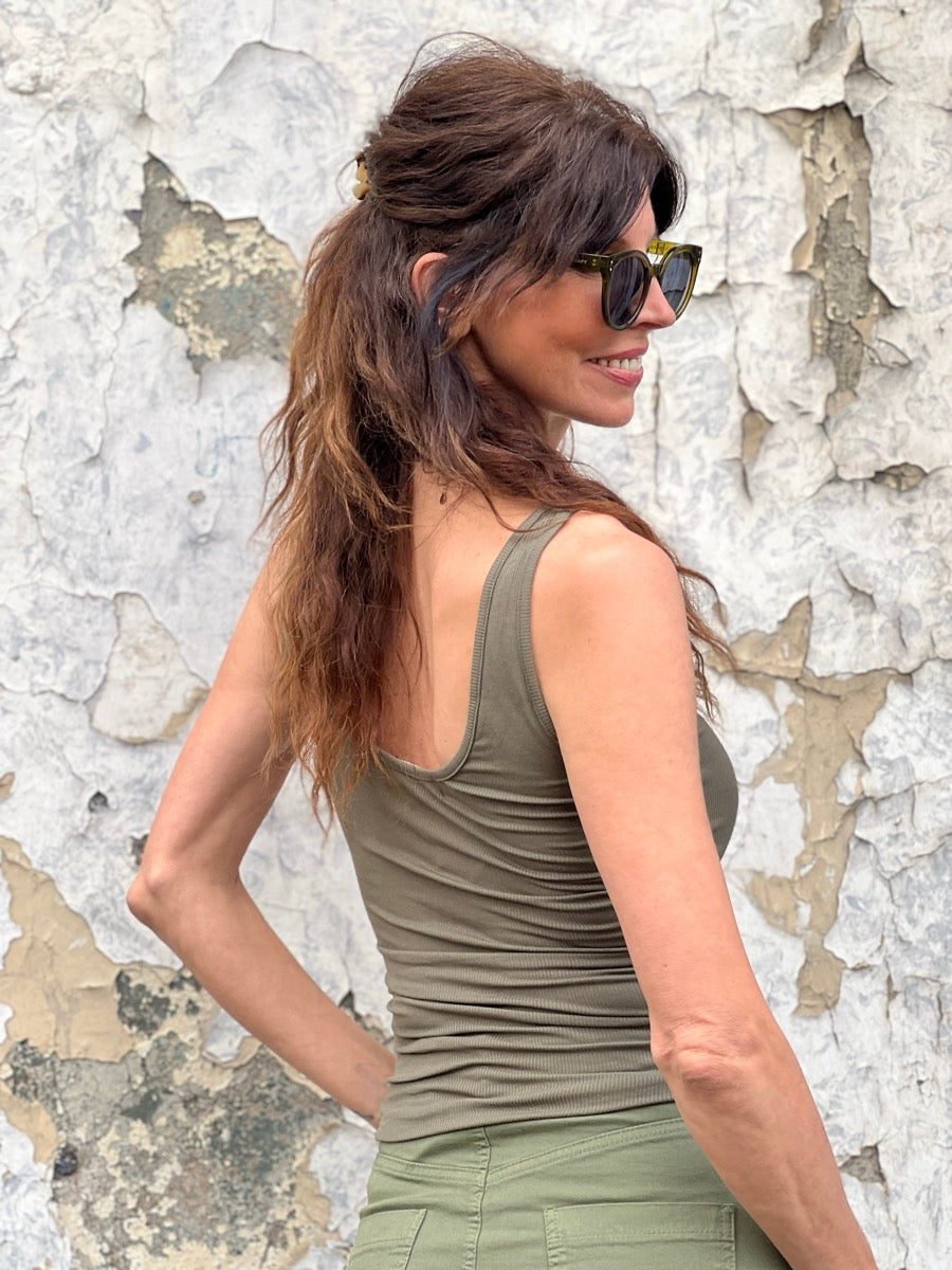 Geripptes Top mit tiefen Rundhals aus elastischen Garn.
