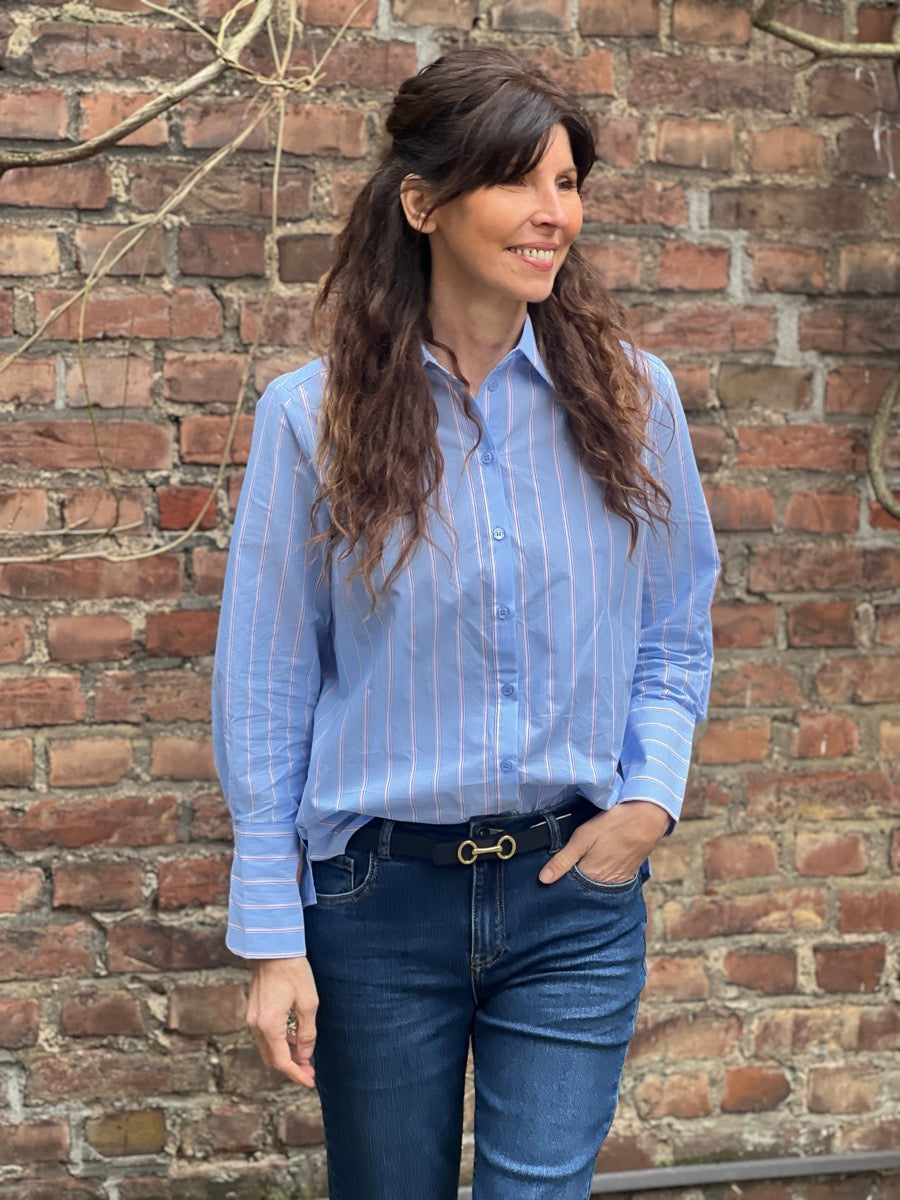 Das Hemd hat ein lässig geschnittene Look in Hellblau mit feinen weißen Streifen. Die Bluse wirkt klassisch und gleichzeitig modern durch den geraden Schnitt und die verlängerten Ärmelmanschetten.