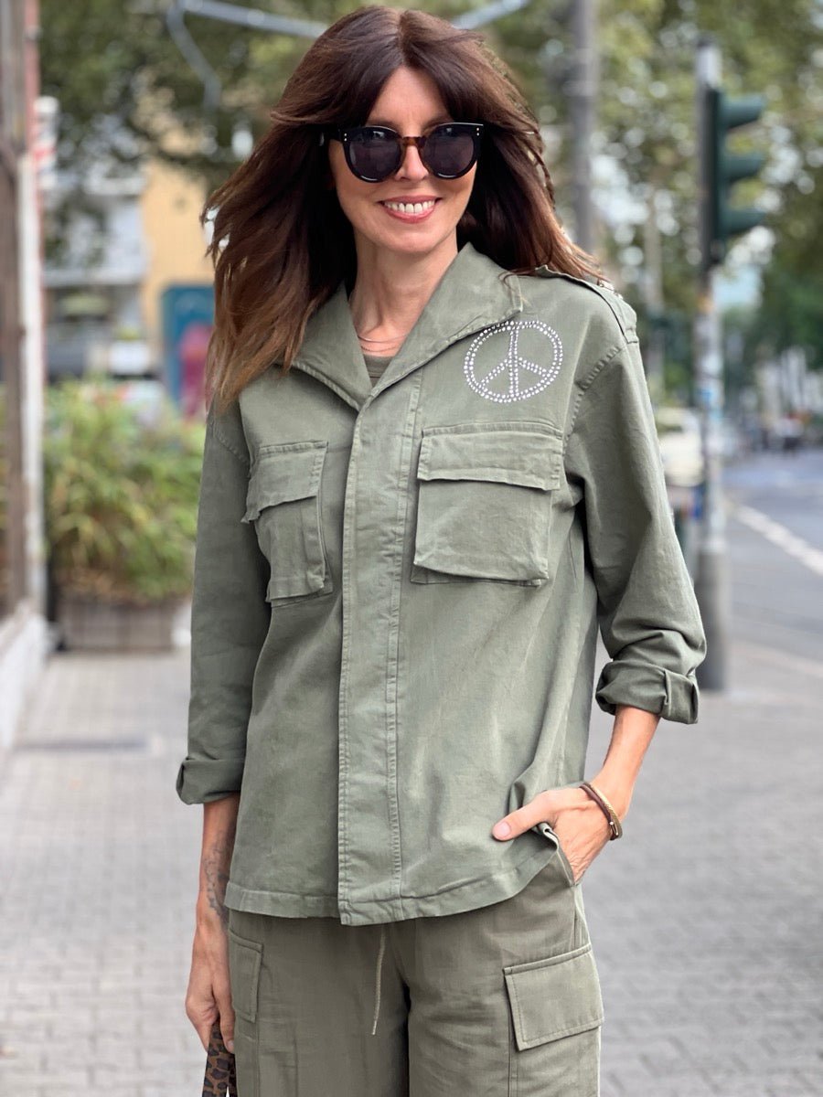 Lässige Jacke im Cargo-Stil mit Strassbesetztem Peace-Zeichen auf Vorder- und Rückseite. Zwei praktische Brusttaschen und hochgekrempelte Ärmel sorgen für entspannten Style. Perfekt für einen legeren Look mit einer Botschaft.