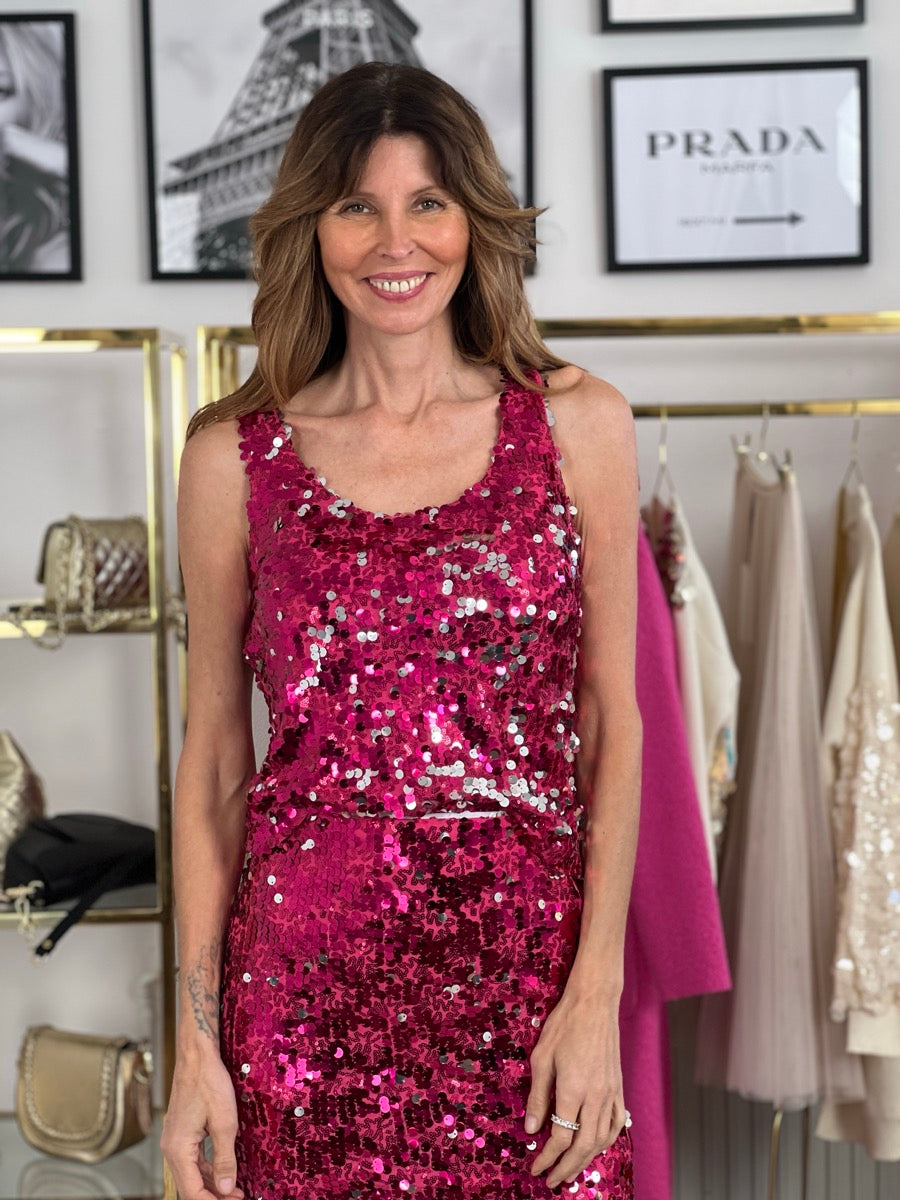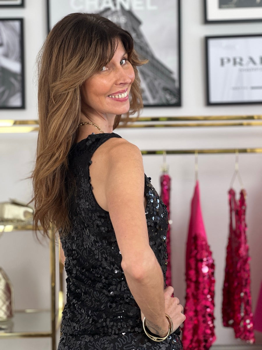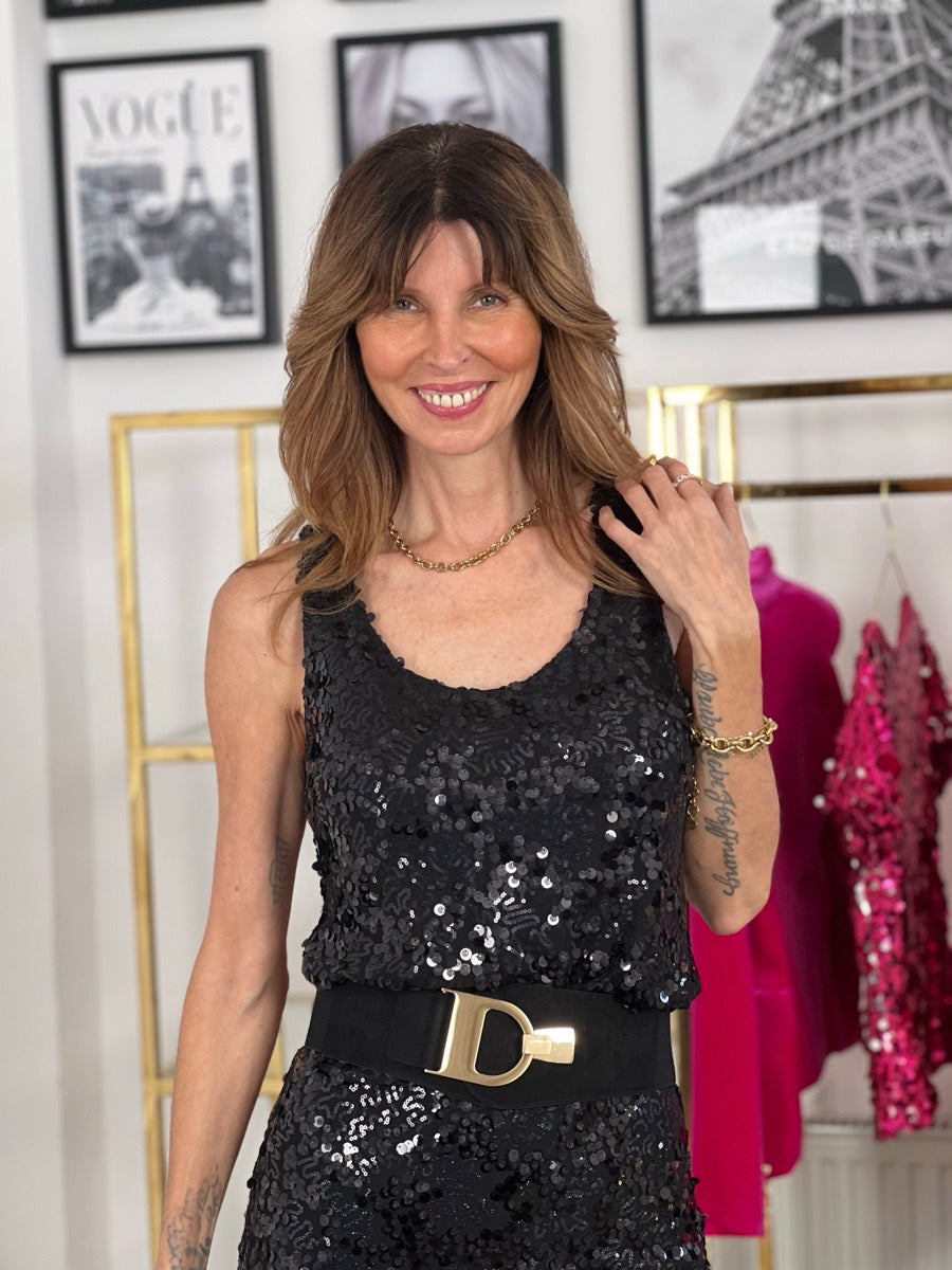 Hose mit Pailletten, elastischem Bund und leicht ausgestellt. Durch das dehnbare Material sitzt der Hose angenehm. Bitte beachtet, dass Pailletten krümeln können und nicht für langes Sitzen geeignet sind.