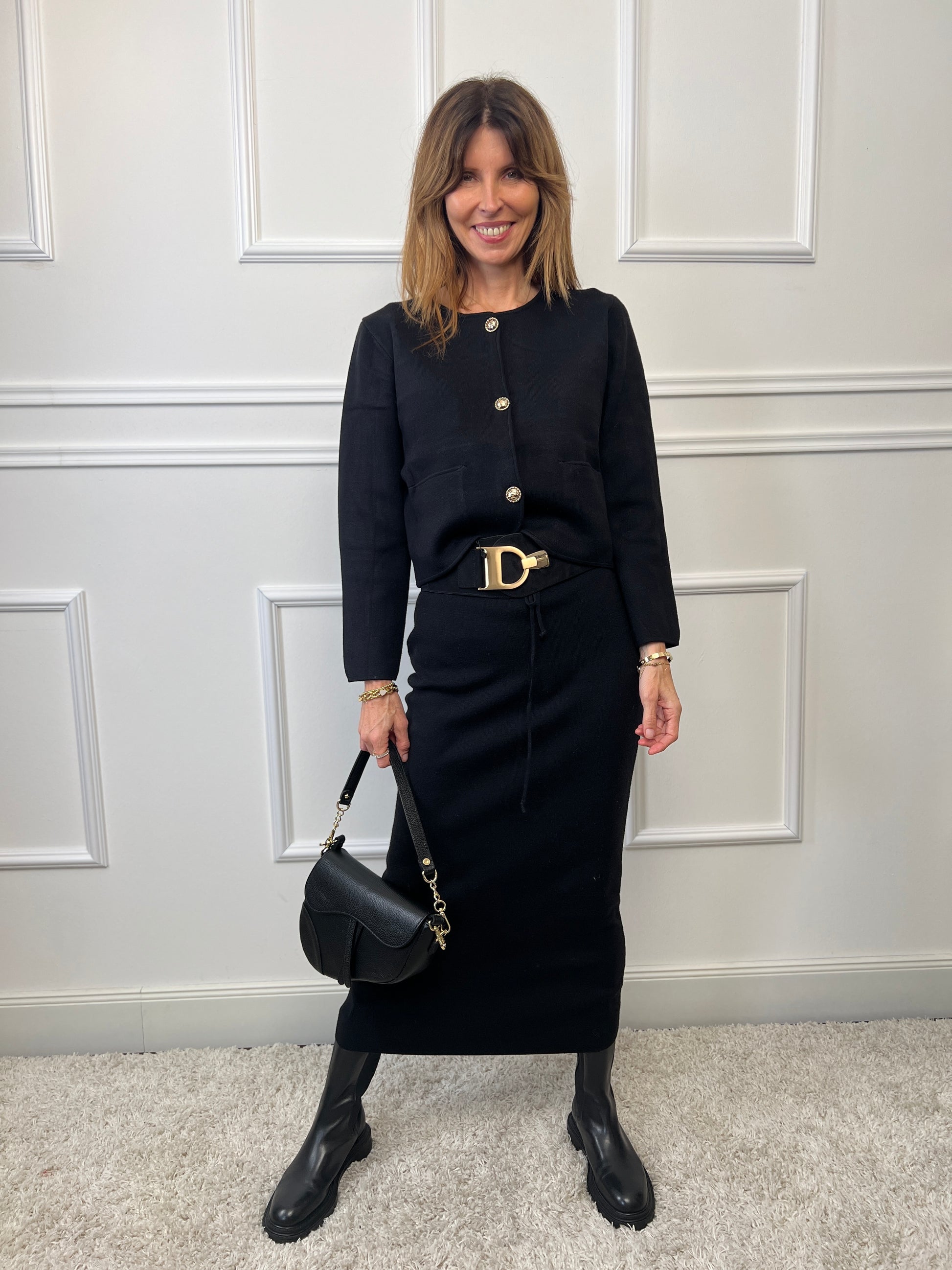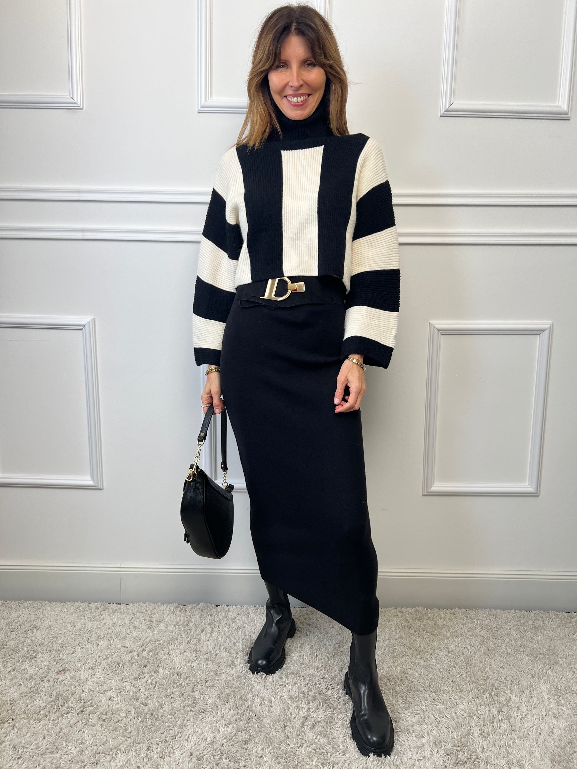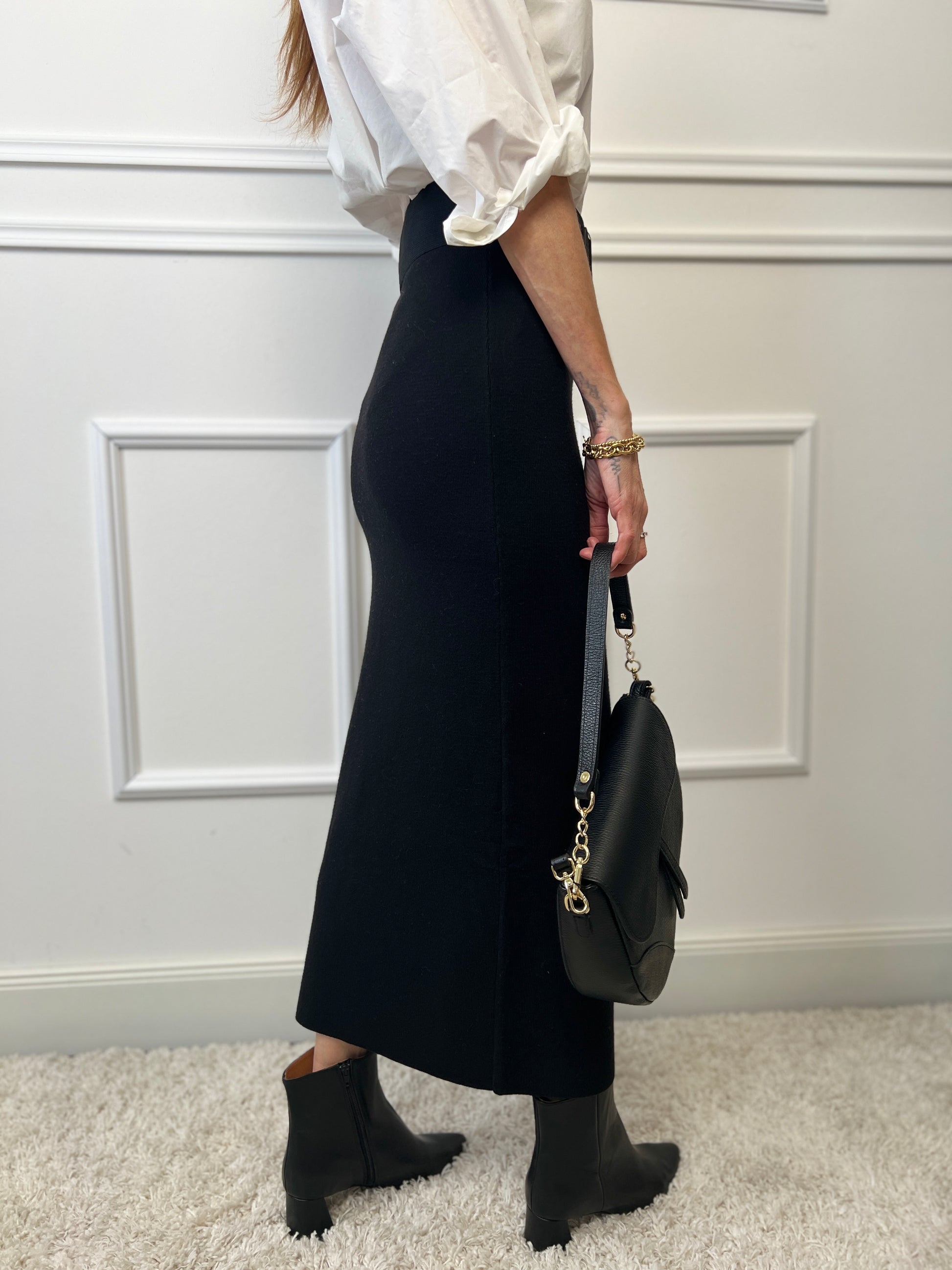 Langer gerade geschnittener Rock mit elastischem Taillenbund und enger Passform.