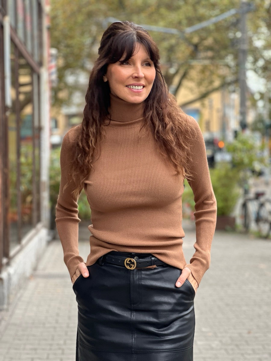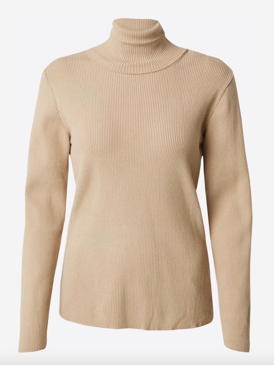 Der weiche Rollkragenpullover mit Rippen-Optik ist ein perfektes Basic für Herbst und Winter. Er hat eine normale Passform, einen hohen Rollkragen und besteht aus 72% Viskose und 28% Polyester. Die Größe S entspricht einer Länge von 62cm und einer Brustweite von 40cm. Sandra, auf dem Foto, hat die Konfektionsgröße 36 und trägt Größe  S