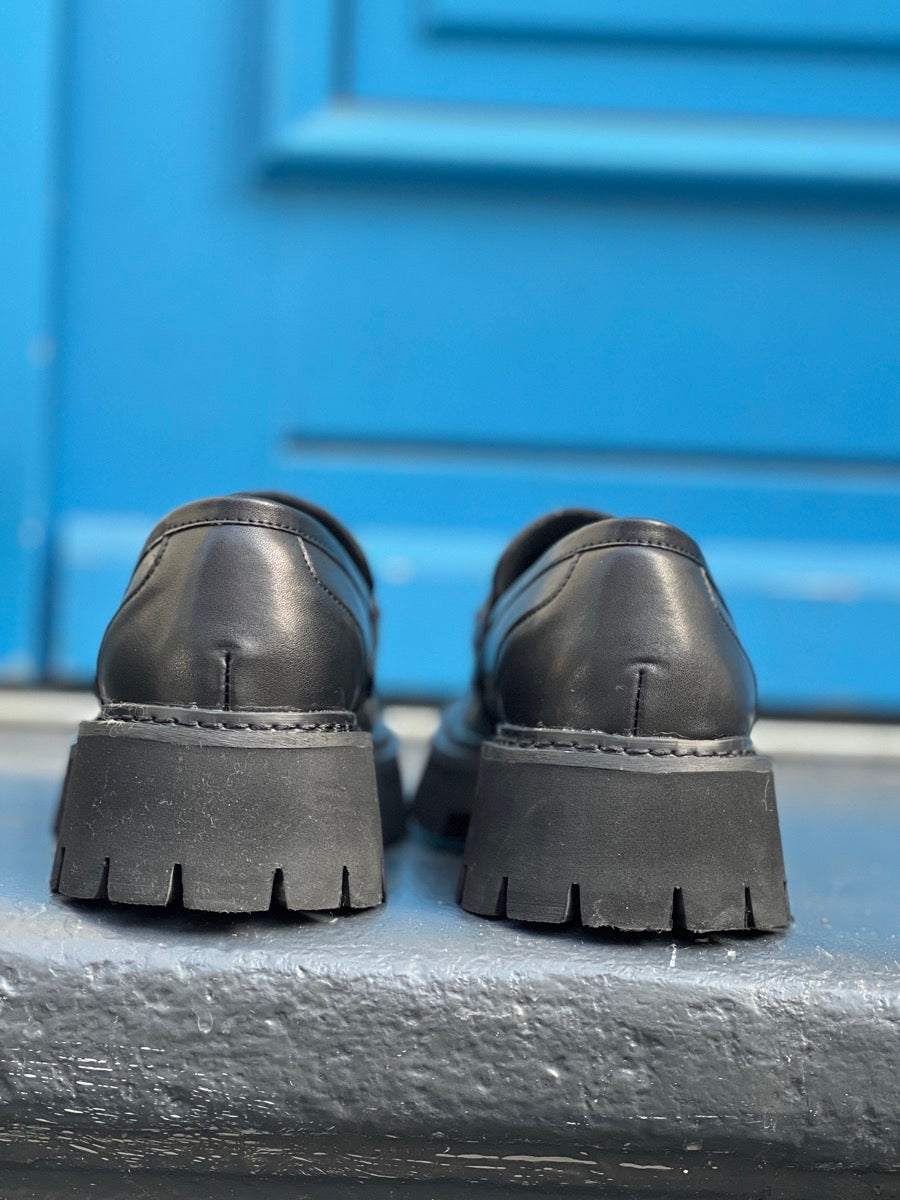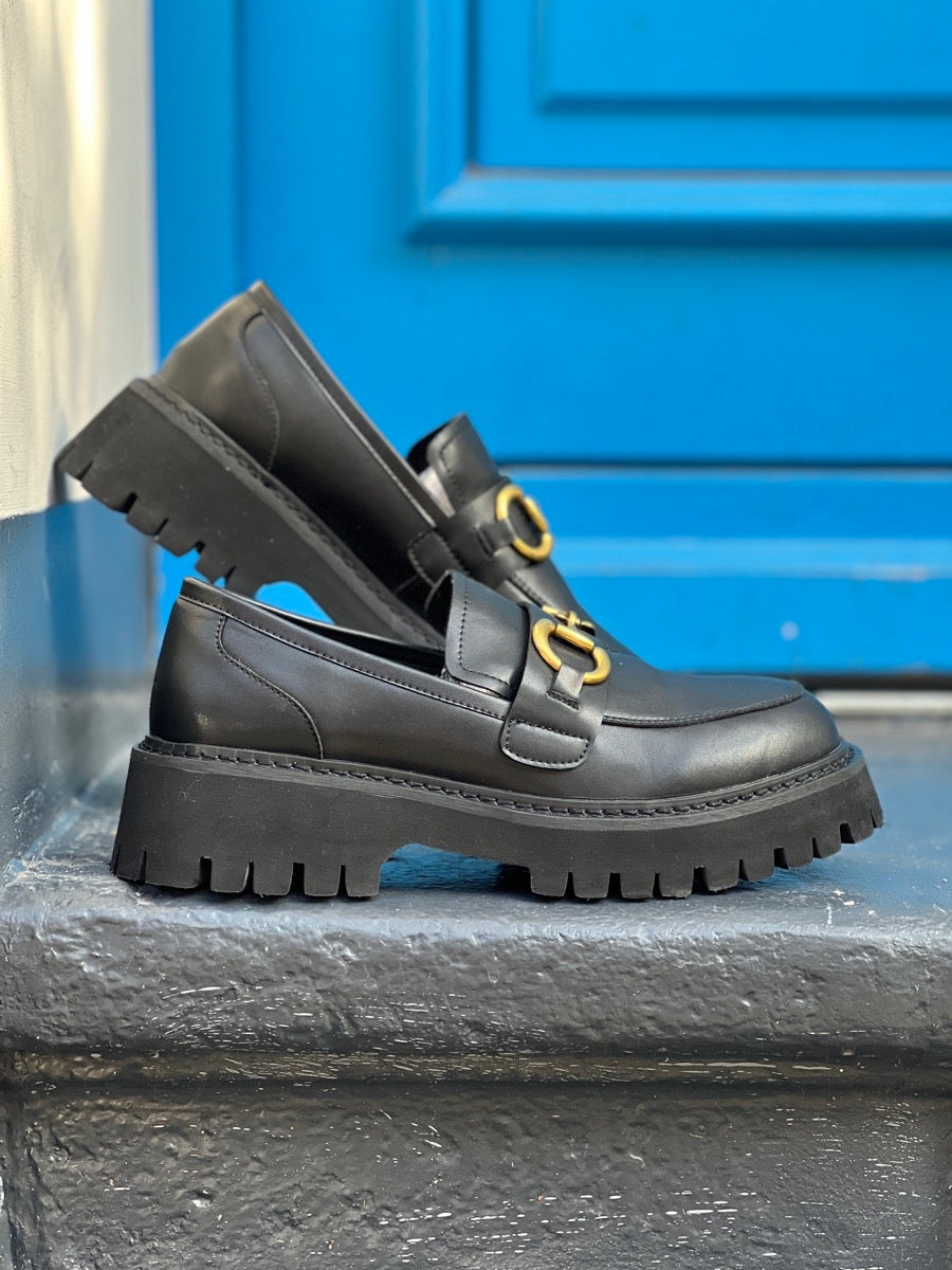 Stylisher, schwarzer College Schuh von Sofie Schnoor mit Profilsohle und goldener Schließe. Er ist sehr leicht und bequem.