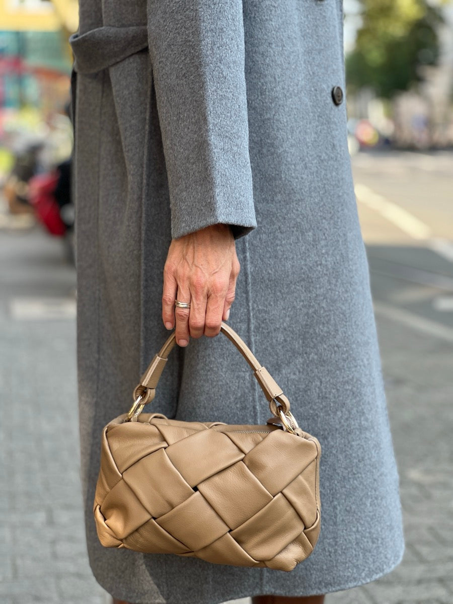 Große Umhängetasche aus Leder im klassischen Design mit Klappdeckel und Verschluss mit goldene details. Das Obermaterial ist gesteppt. Die Innentasche hat einen Reißverschluss.