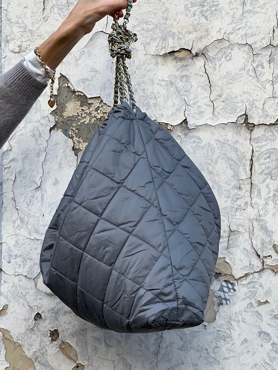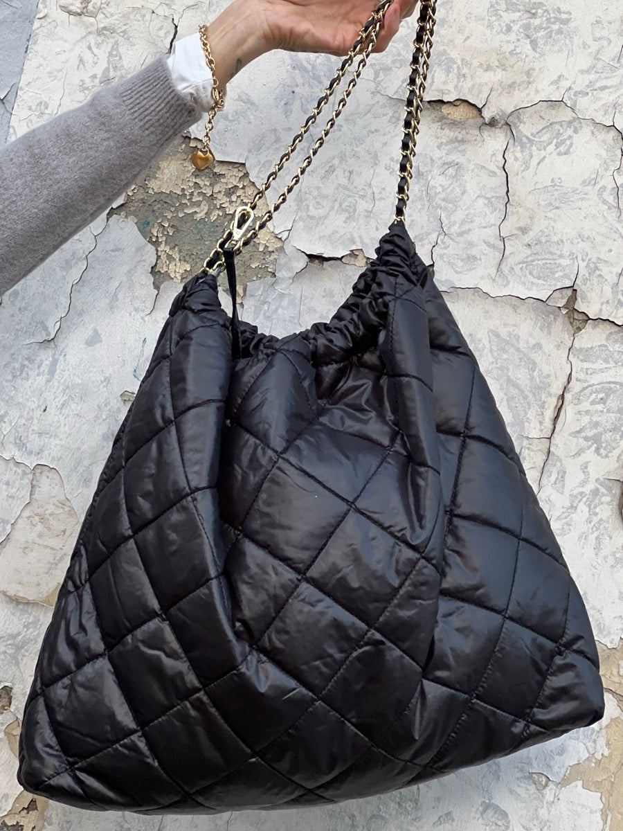 Extra grosse Umhängetasche im Beutel-Stil aus Nylon mit goldenen Ketten Details.