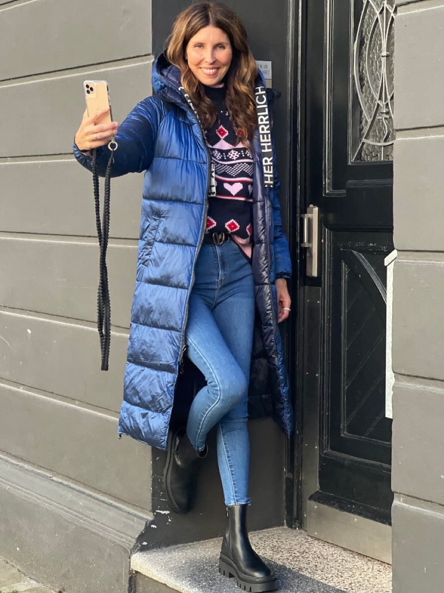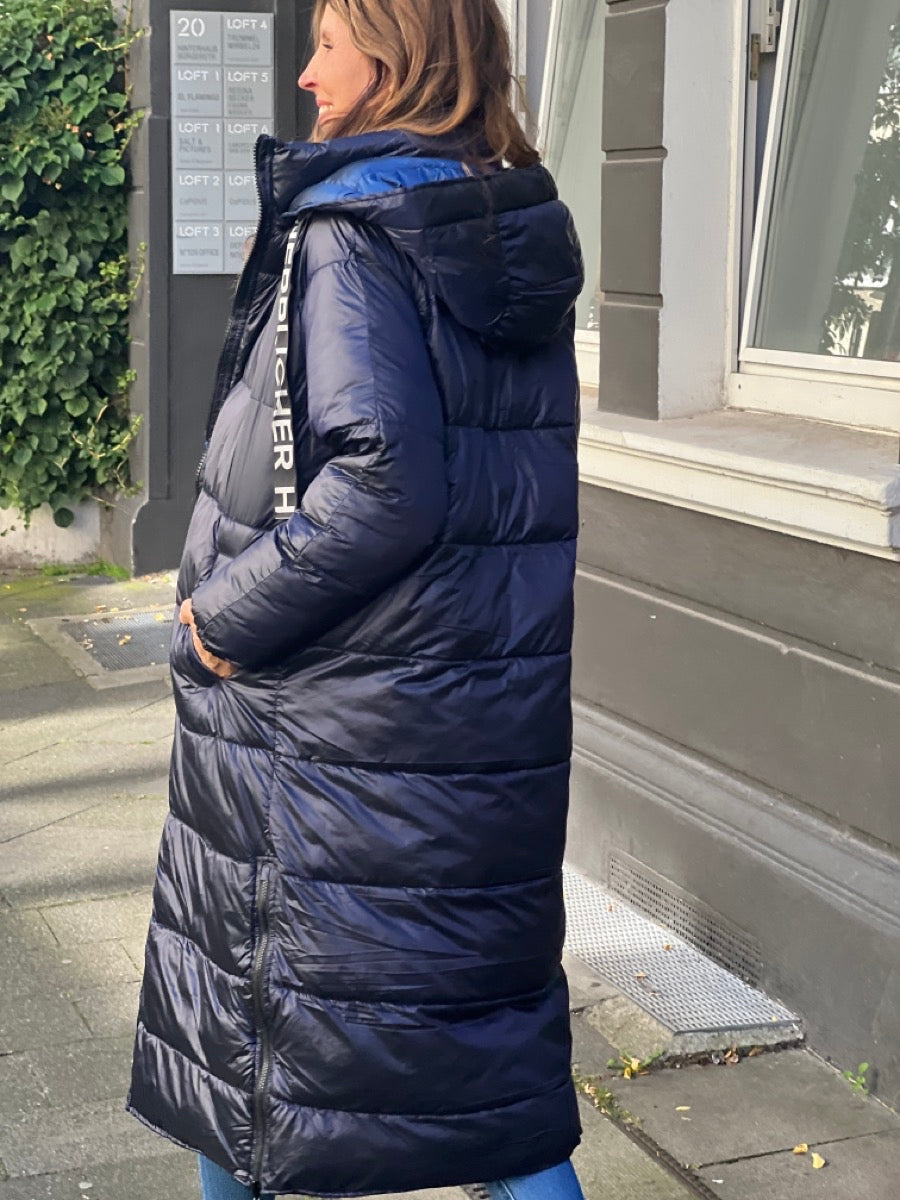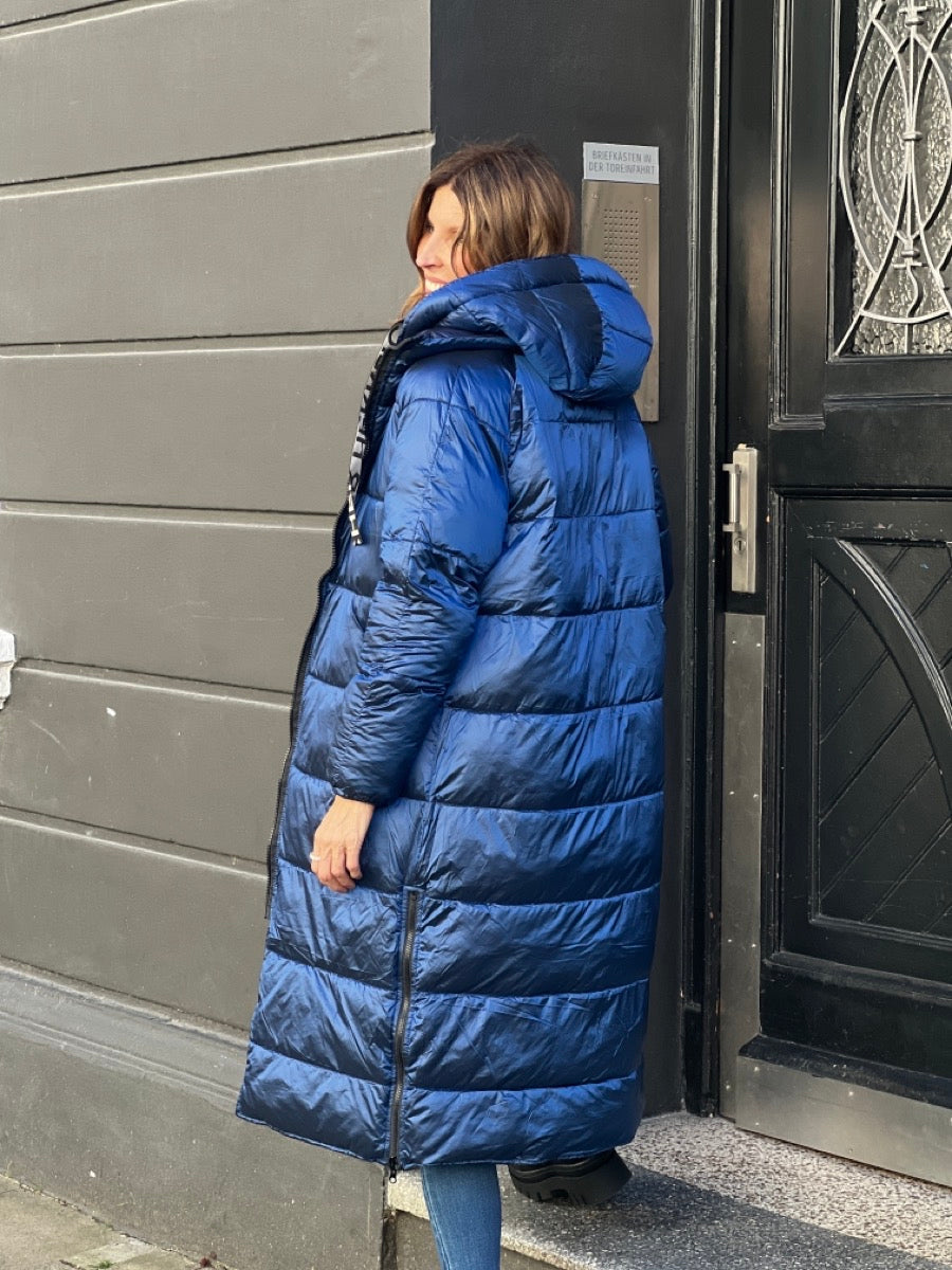 Langer Steppmantel mit Quersteppung aus recyceltem Material mit daunenfreier Füllung zum Wenden. Die große Kapuze und die breiten Logo-Bandkordeln sowie die seitlichen Reißverschlüsse sind typische für dieses Modell was eher etwas größer ausfällt. Die Größe XS kann bis zur Größe M getragen werden.