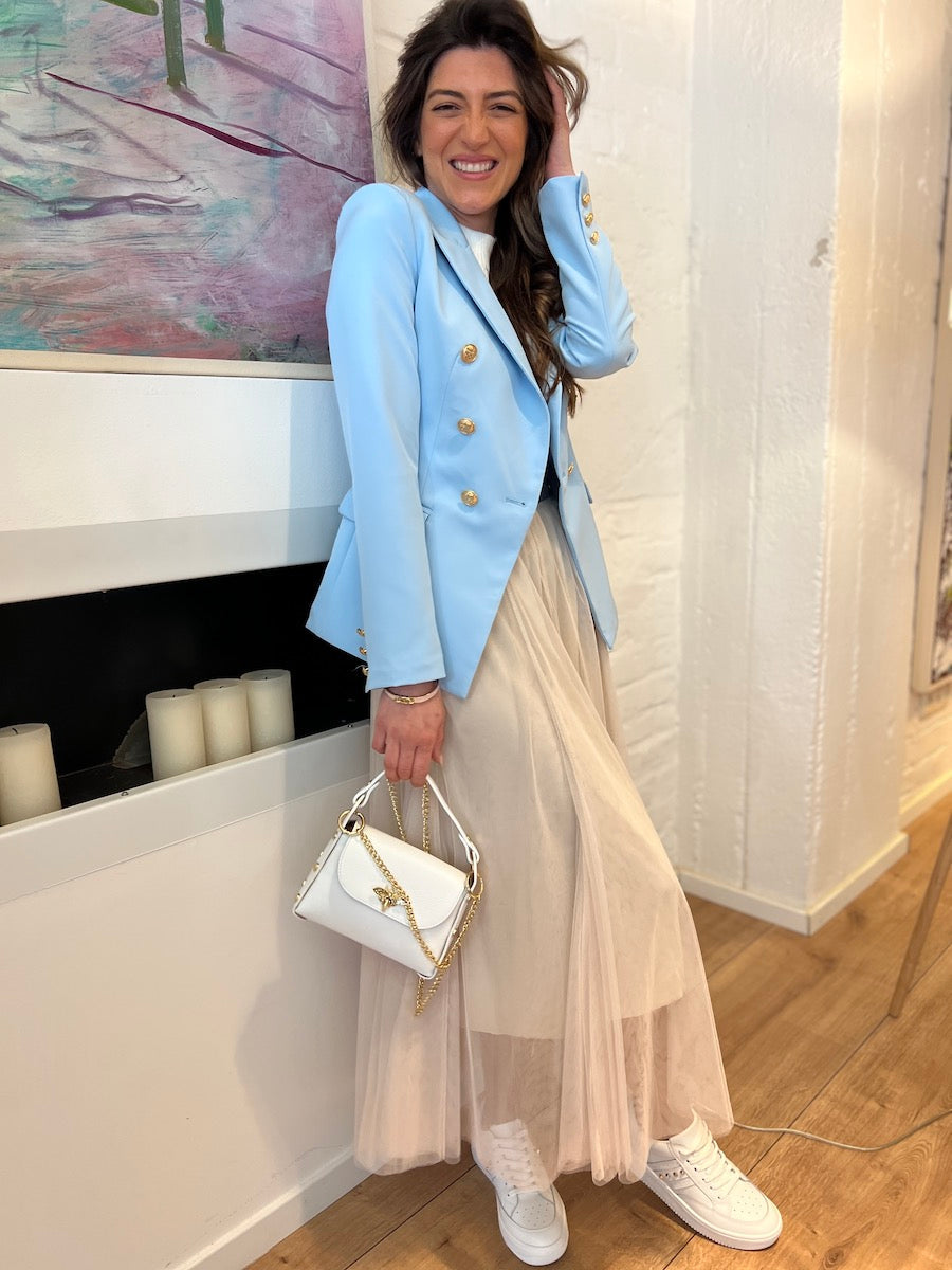 Doppelreihiger Blazer mit Klappentaschen und goldenen Knöpfen. Die Jacke hat Schulterpolster.
