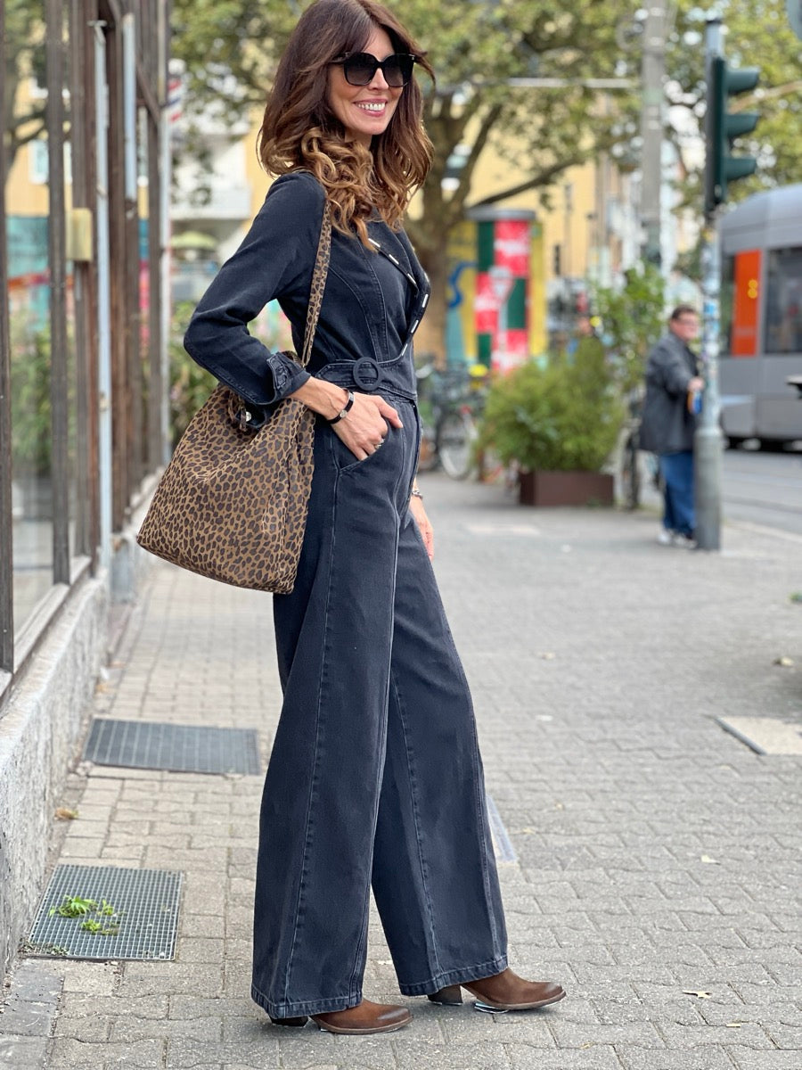 Denim Jumpsuit mit V-Ausschnitt und Nieten Details.