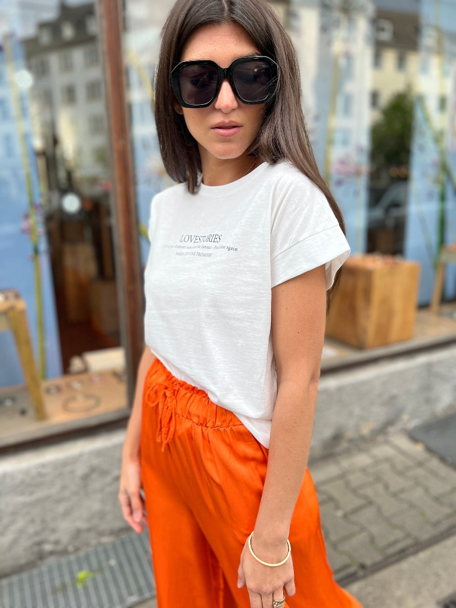 Hose in Satin-Optik mit geradem Beim und mit elastischem Bund und Kordel.