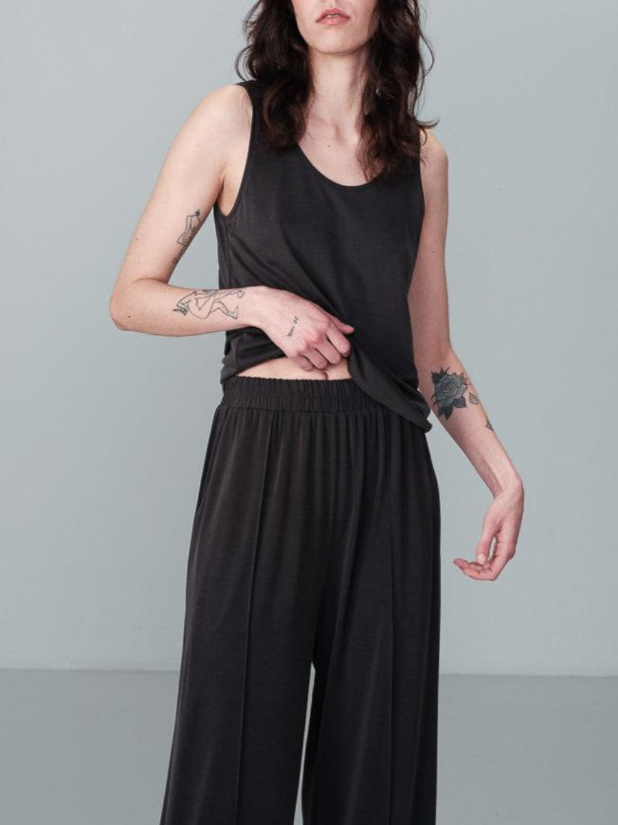 Die NESS Hose besticht durch ihren weiten Schnitt und das weiche, hautfreundliche Material aus 70% Modal. Mit dem elastischen Bund bietet sie maximalen Tragekomfort und ist ein vielseitiges Basic für lässige Alltagslooks. Die vorderen Falten und die italienischen Taschen verleihen der Hose eine elegante Note, während der entspannte Schnitt für Bewegungsfreiheit sorgt.