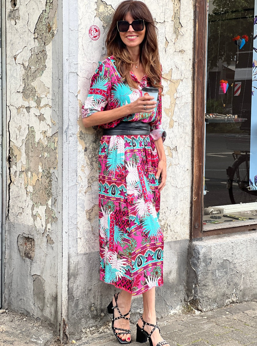 Entspannte Passform mit elastischem Bund. Maße Gr. XS: Bund bis 41 cm und Länge 100 cm. Sandra, auf dem Foto, trägt Gr. S.