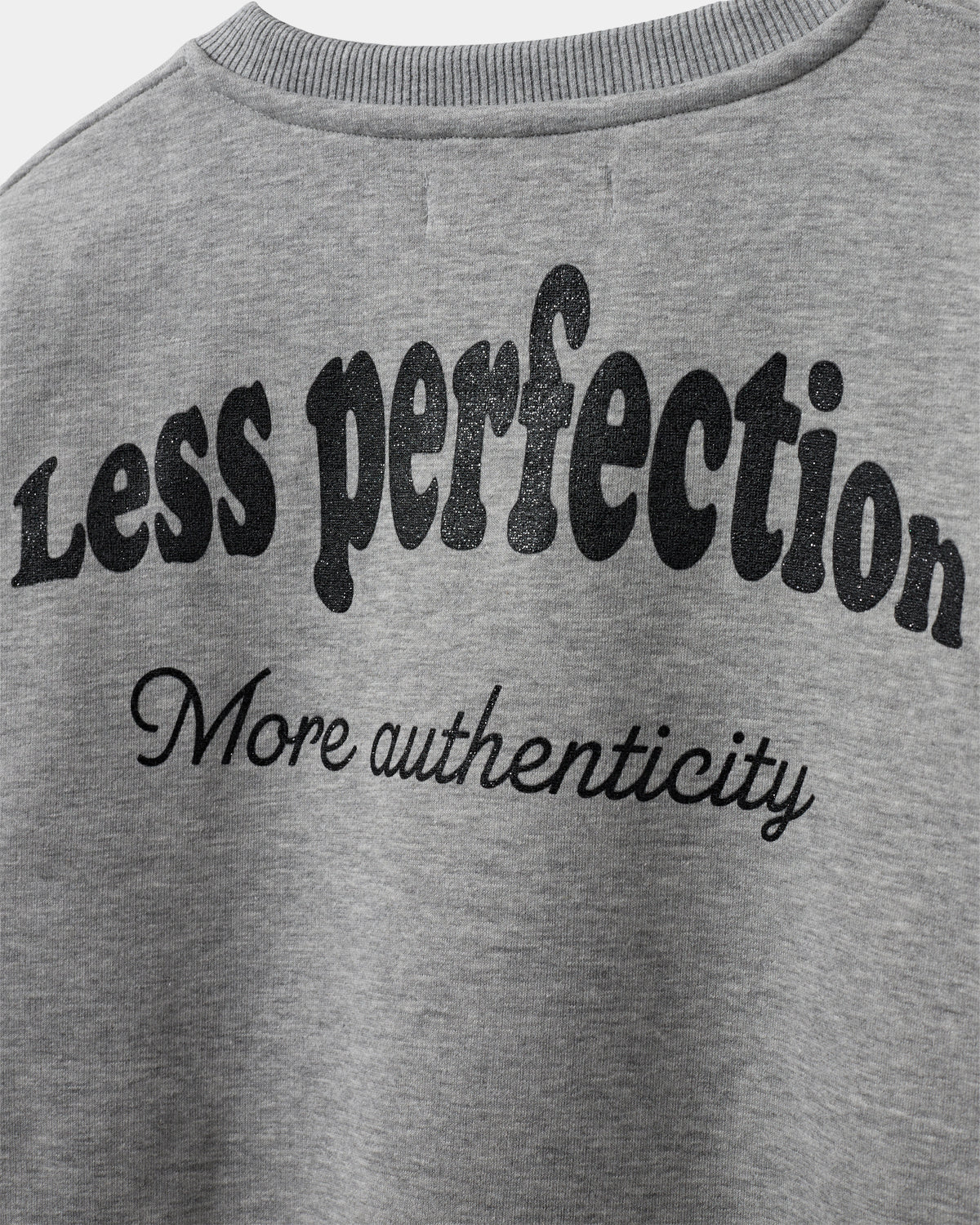 Auf der Rückseite prangt der Schriftzug „less perfection more authenticity“ in einer stilvollen Schriftart, die dem Sweatshirt Tiefe und Charakter verleiht.