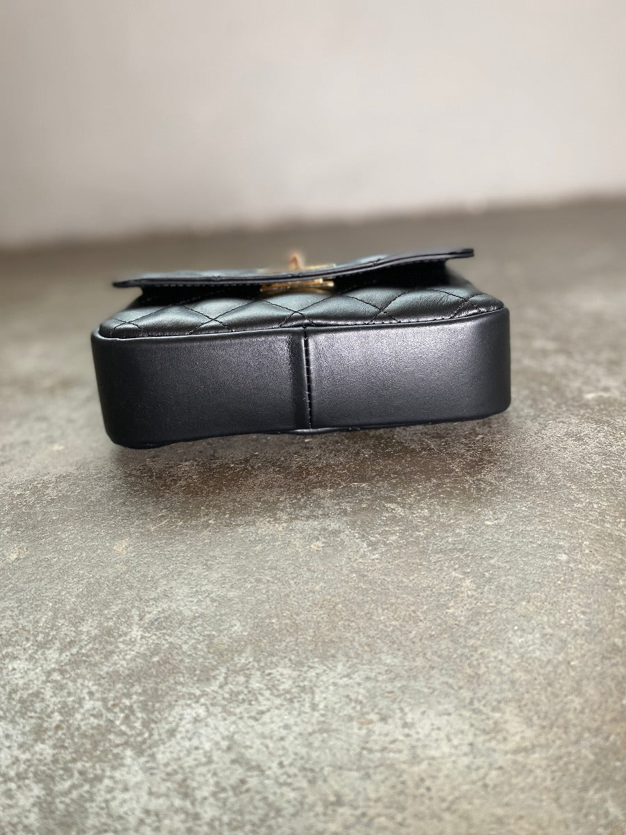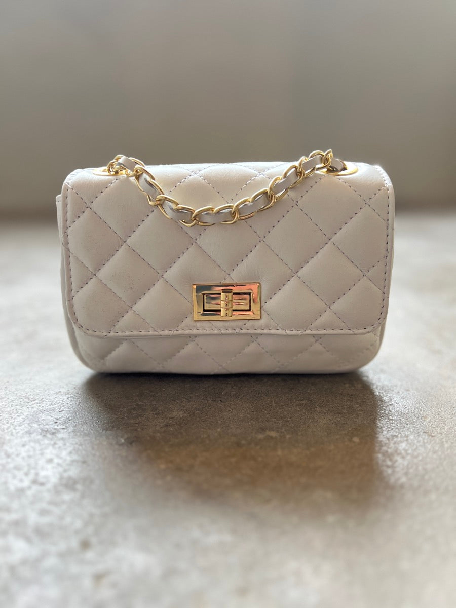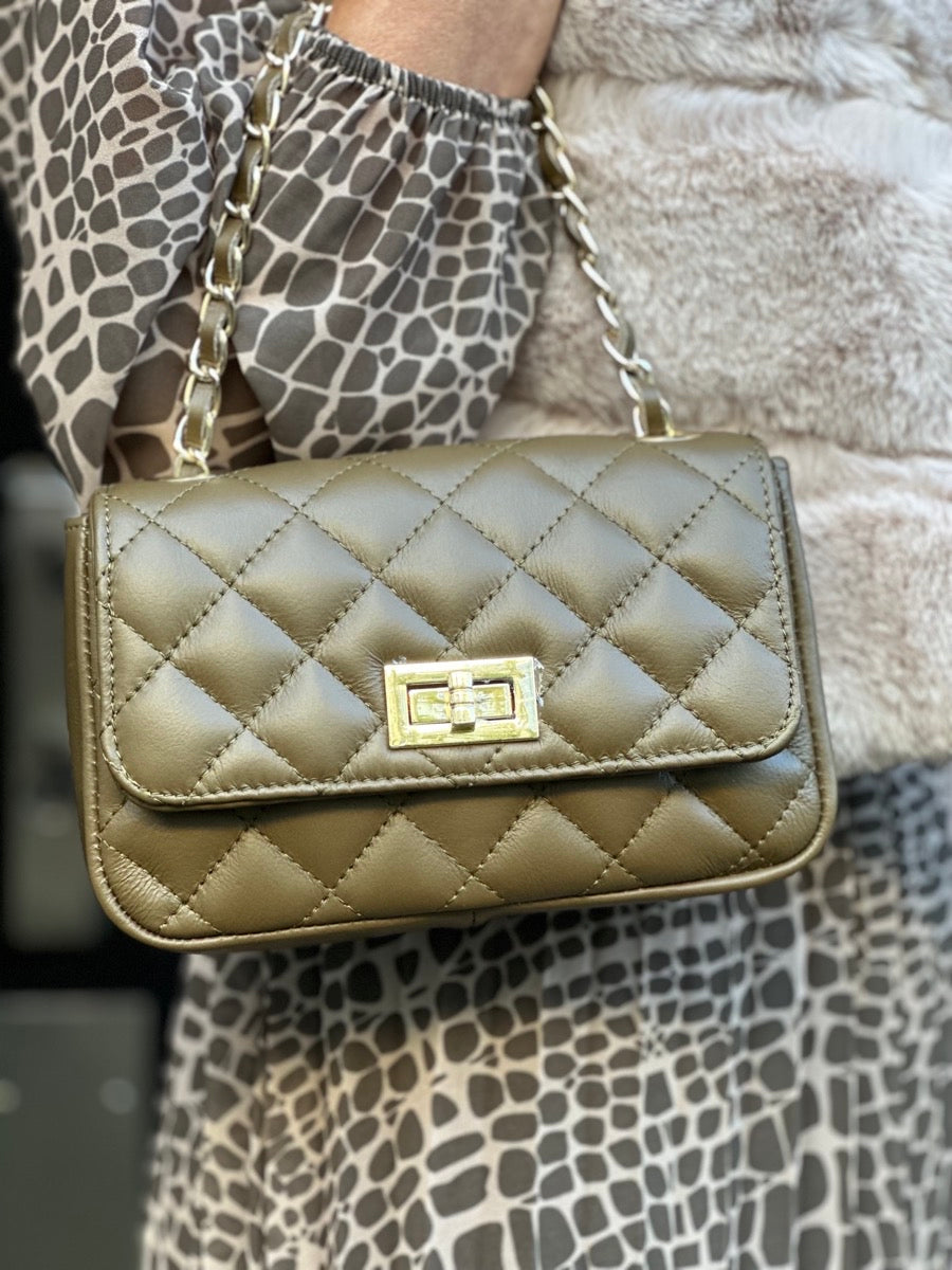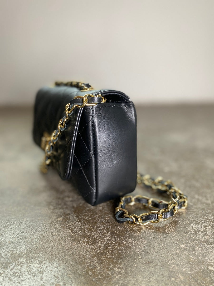 Die Tasche hat auch eine goldene Kette mit Lederriemen, die lang genug ist, um sie über der Schulter oder quer über dem Körper zu tragen.