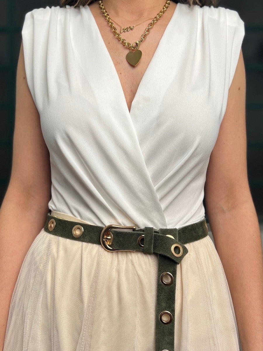 Maxi-Gürtel mit goldenen Ösen. Perfekter Styling-Partner zu Kleidern und Röcken. Kann auch als Taillengürtel getragen werden.