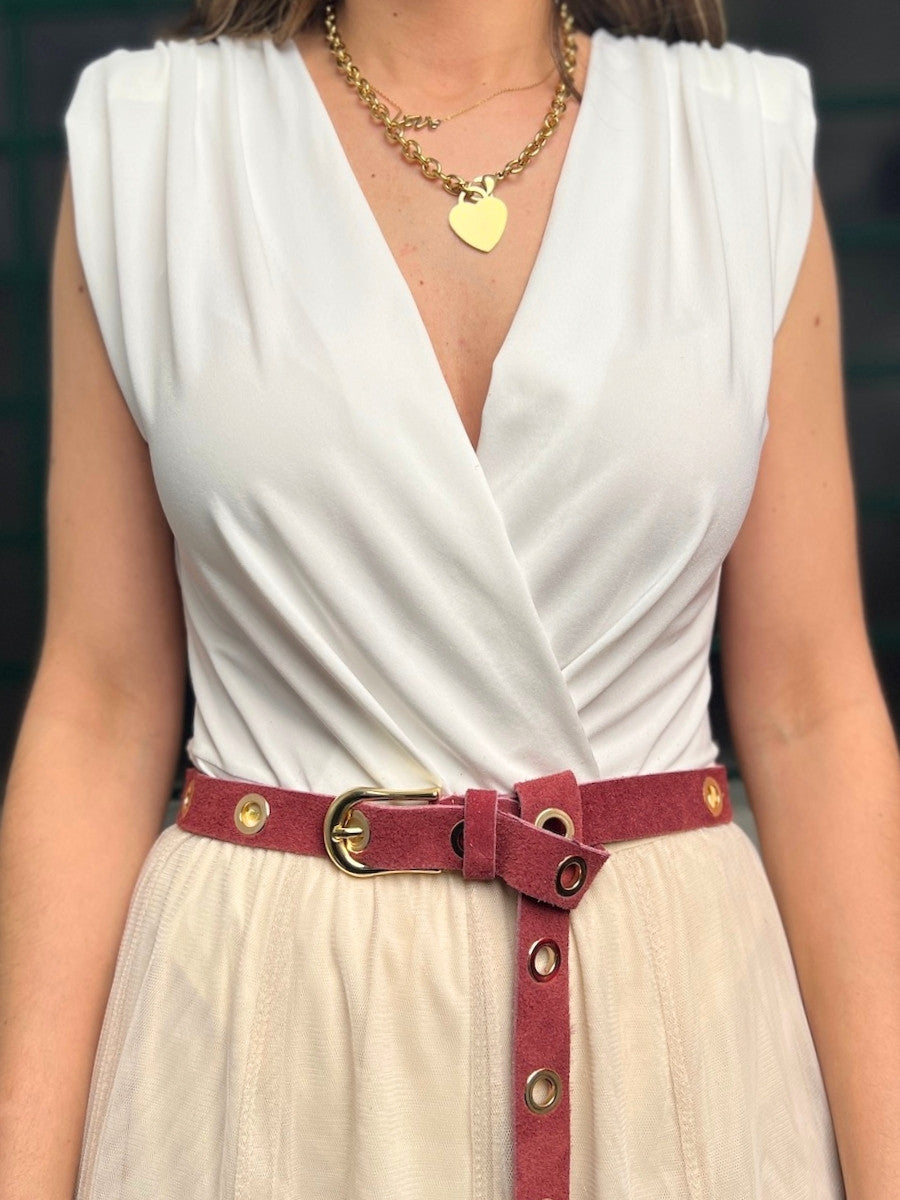 Der Gürtel ist aus Veloursleder.