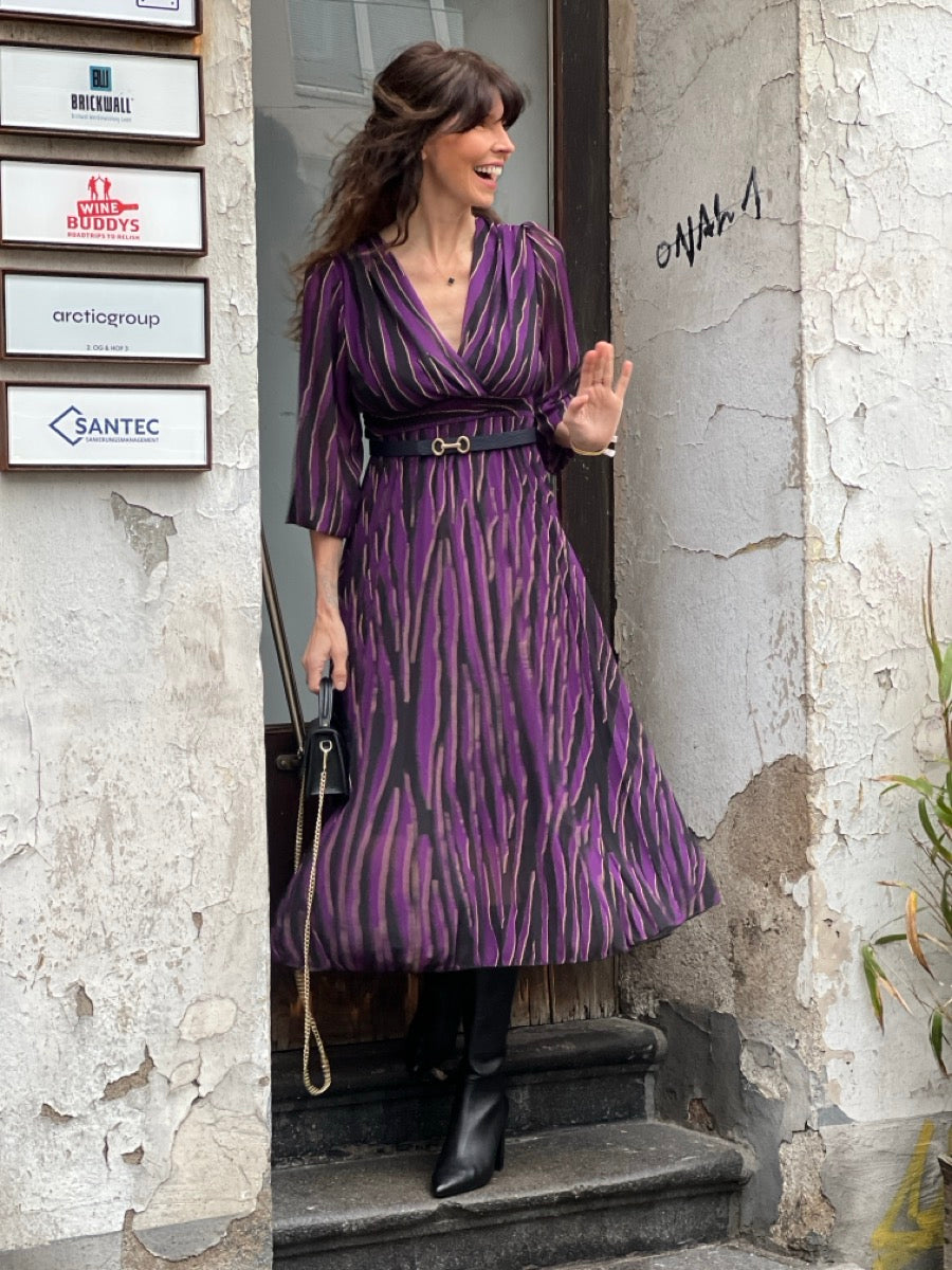 Langes fließendes Kleid mit V-Ausschnitt, elastischem Taillenbund und Zebra Print. Das Kleid ist gefüttert und nur die langen Arme sind leicht transparent.