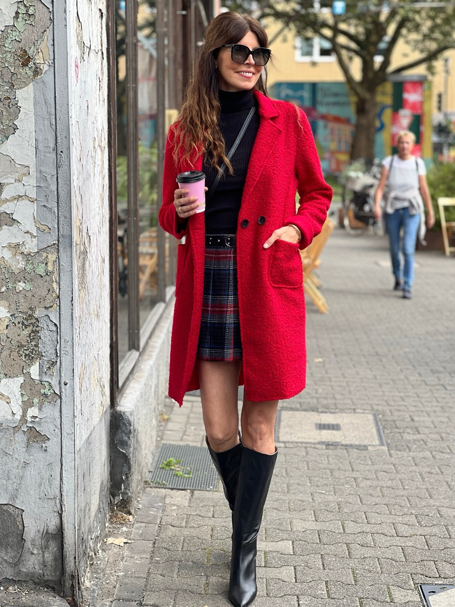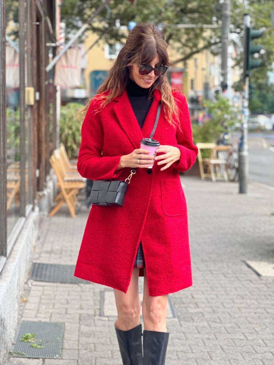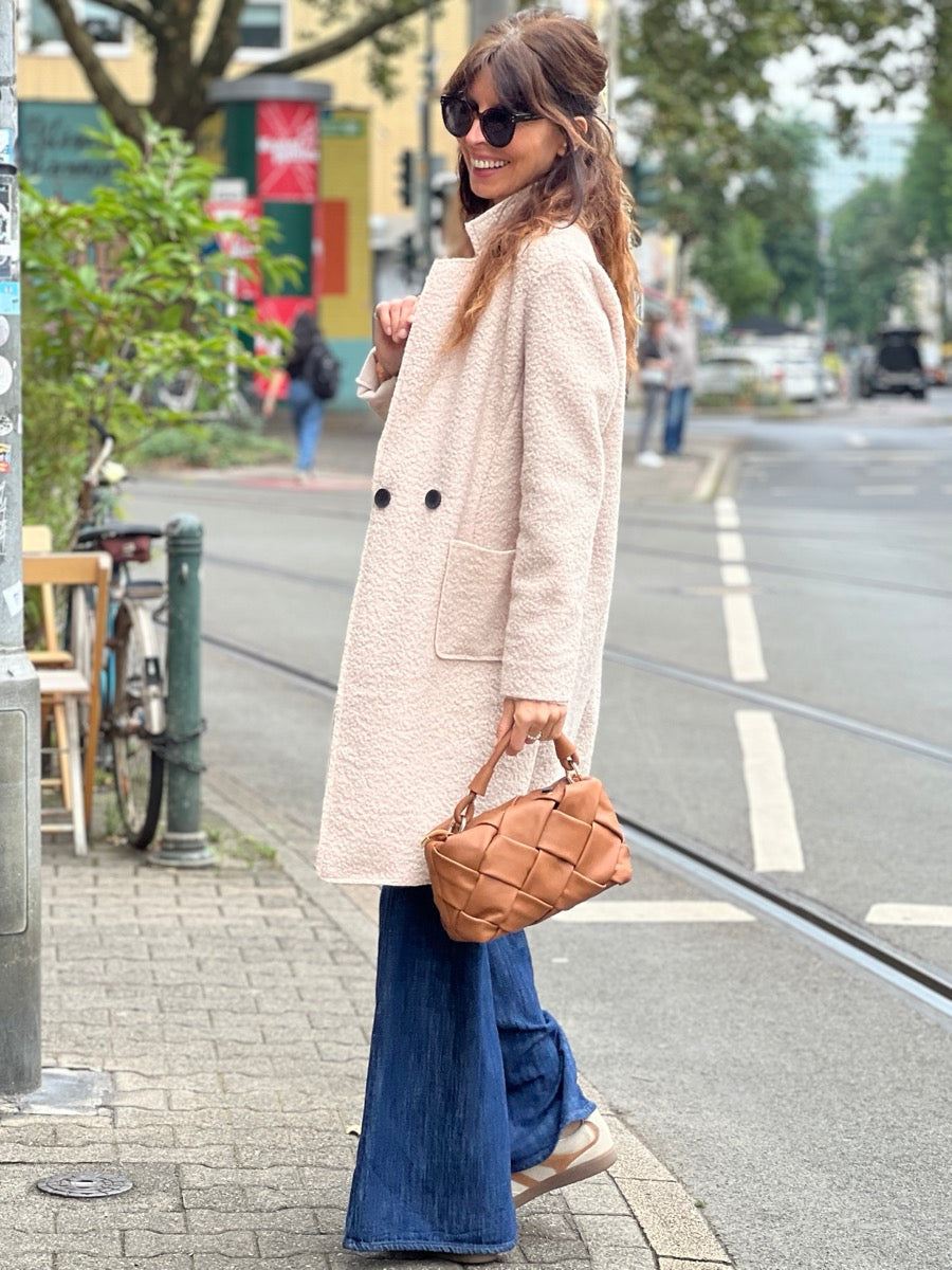 Dieser stilvolle Bouclé Mantel besticht durch seine weiche, strukturierte Oberfläche und eine zeitlose, elegante Passform. Die doppelreihige Knopfleiste und praktischen Seitentaschen verleihen dem Mantel eine moderne Note.