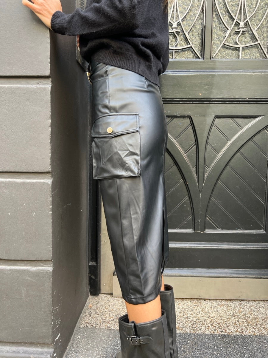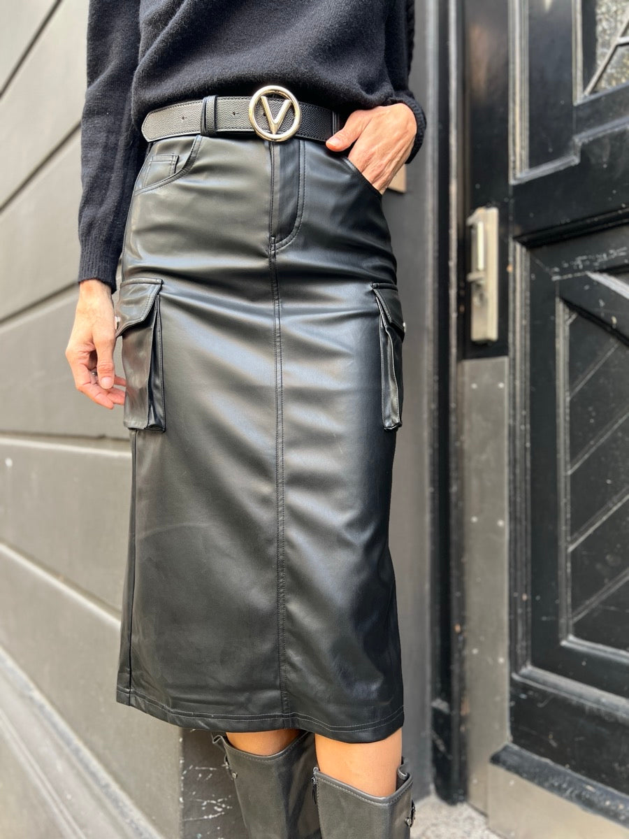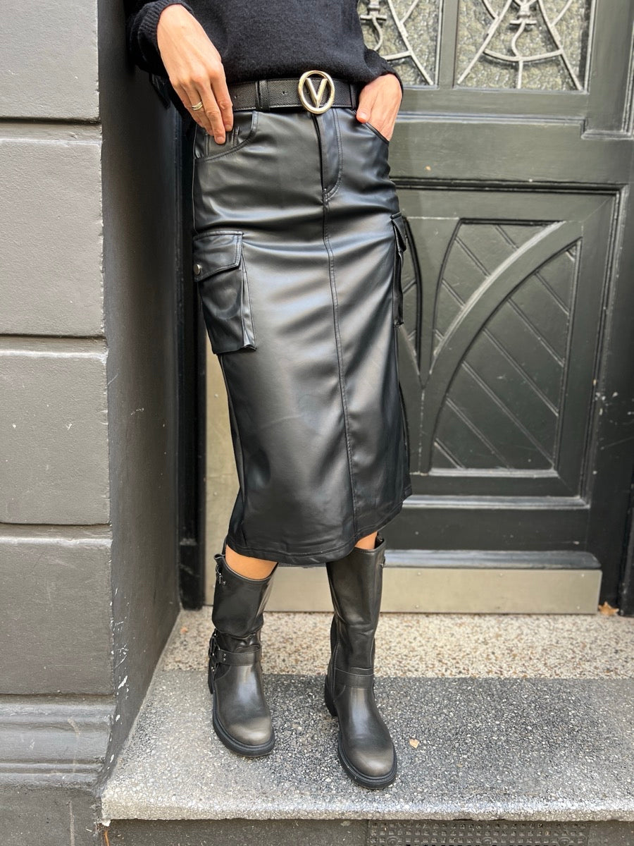 Stylisher Midirock im Cargo-Style aus Lederimitat mit silbernen Zipper.